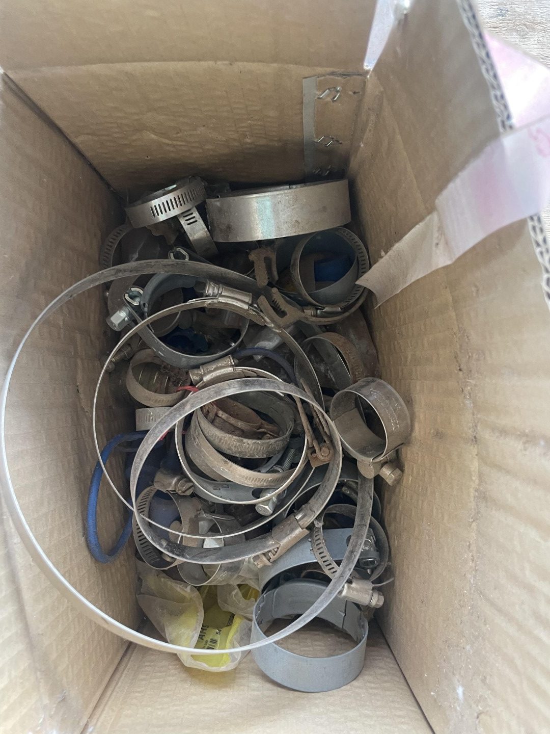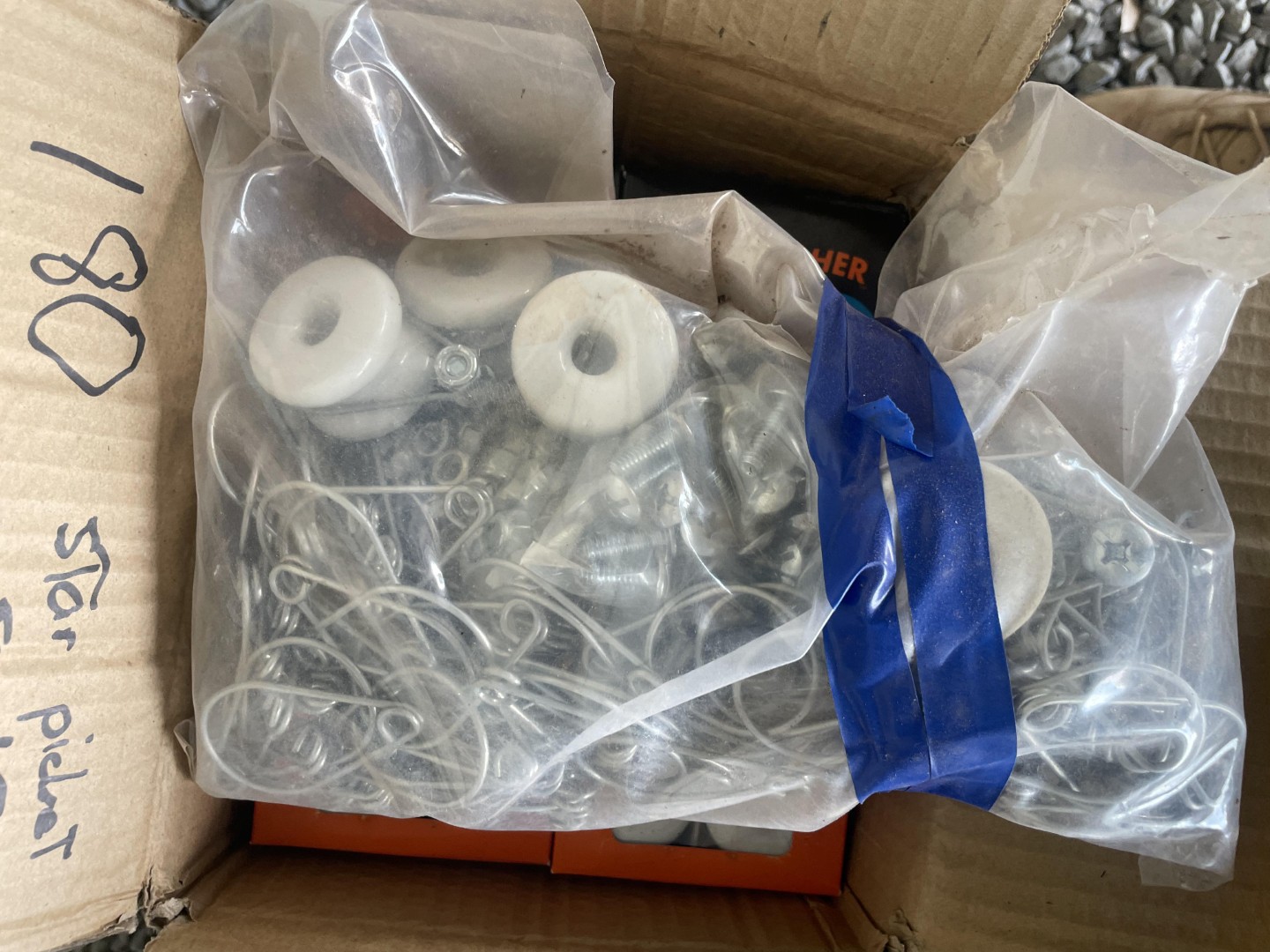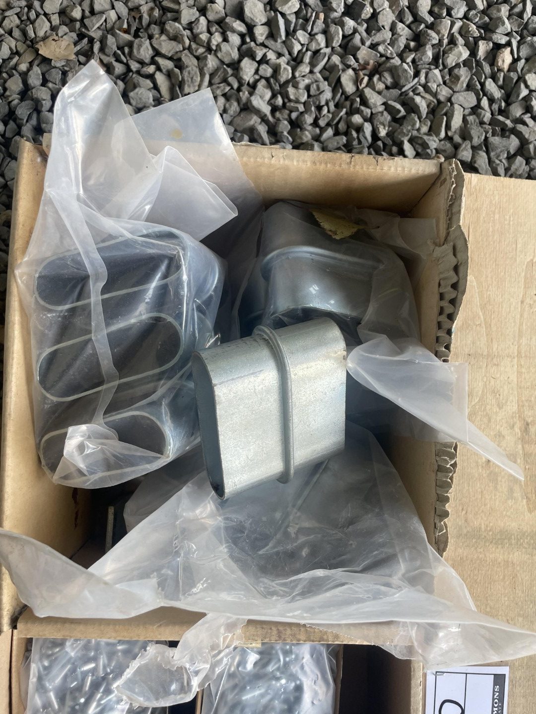 Lot 100. Qty timber hex head screws, Sundry Clamps, Bugle Head Screws, 2 x boxes of Rivets, Oval Cattle Rail Joiners.