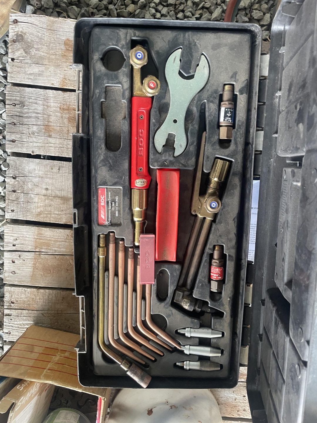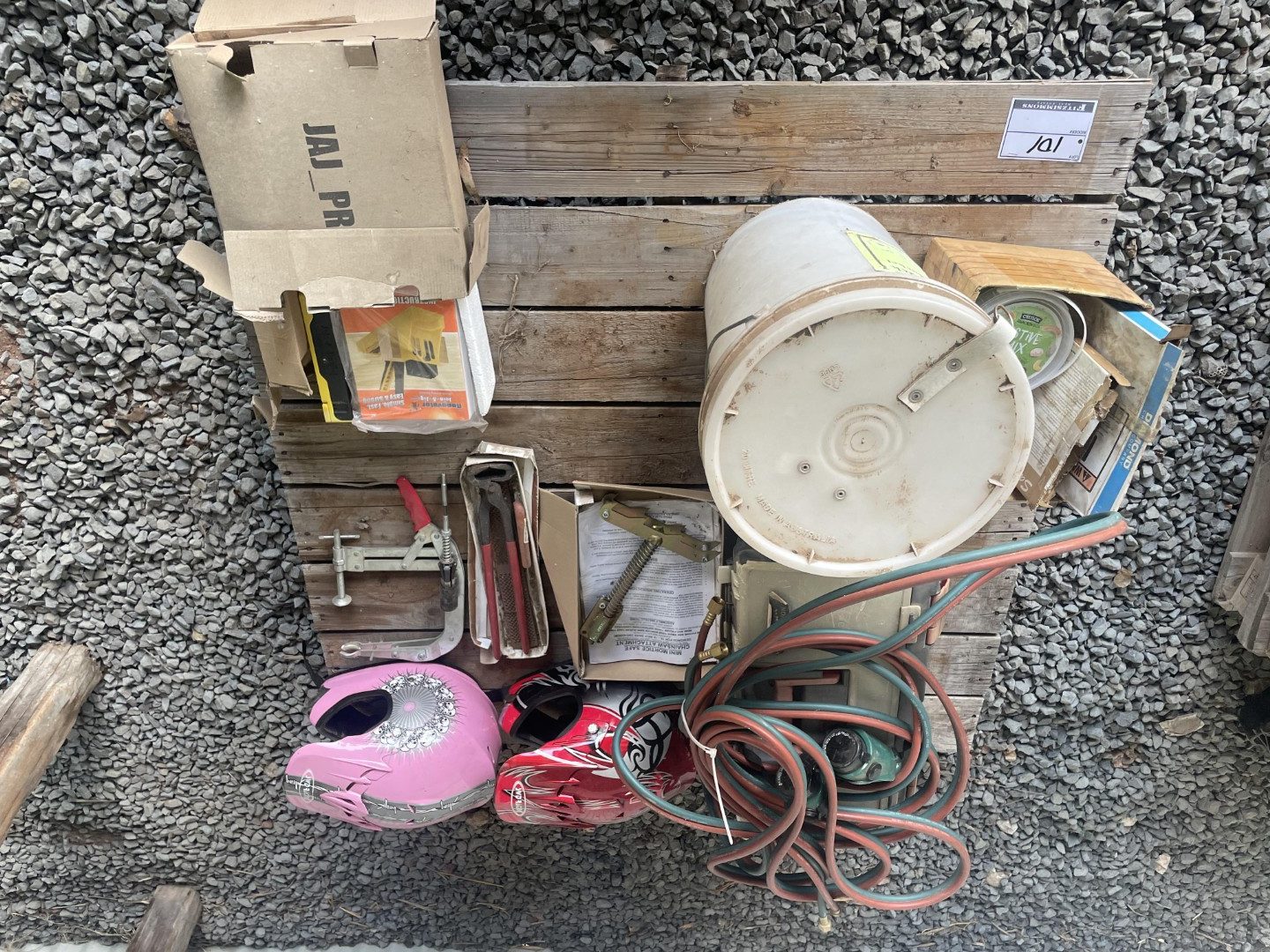 Lot 101. 2 small motorcycle helmets – Oxy set – mini mortice safe chainsaw attachment.