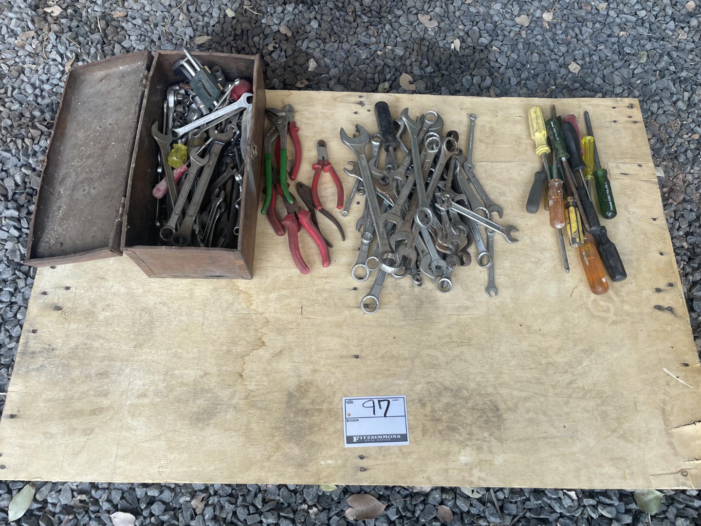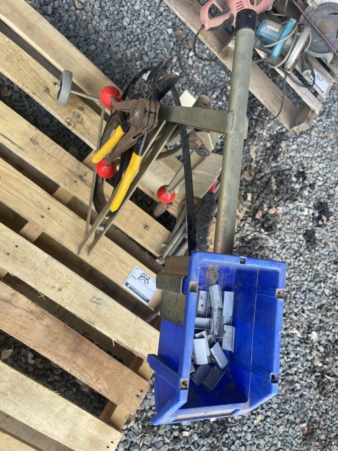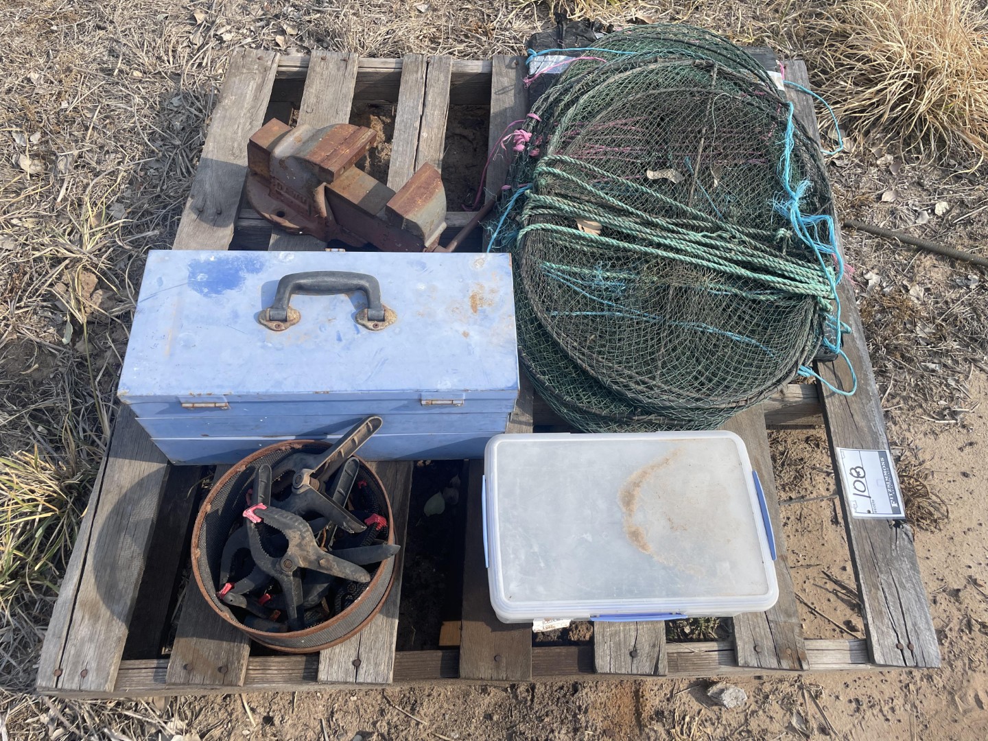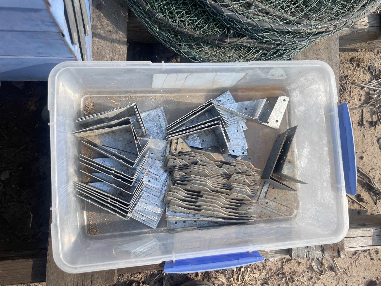 Lot 108. Empty tool box, Dawn Vice, Sundry nailing brackets, Small clamps.
