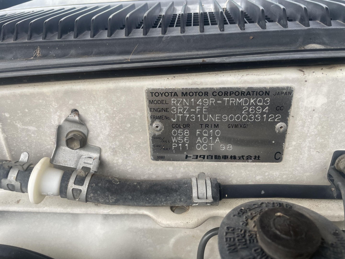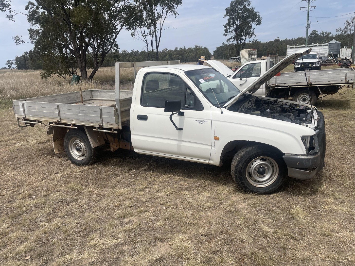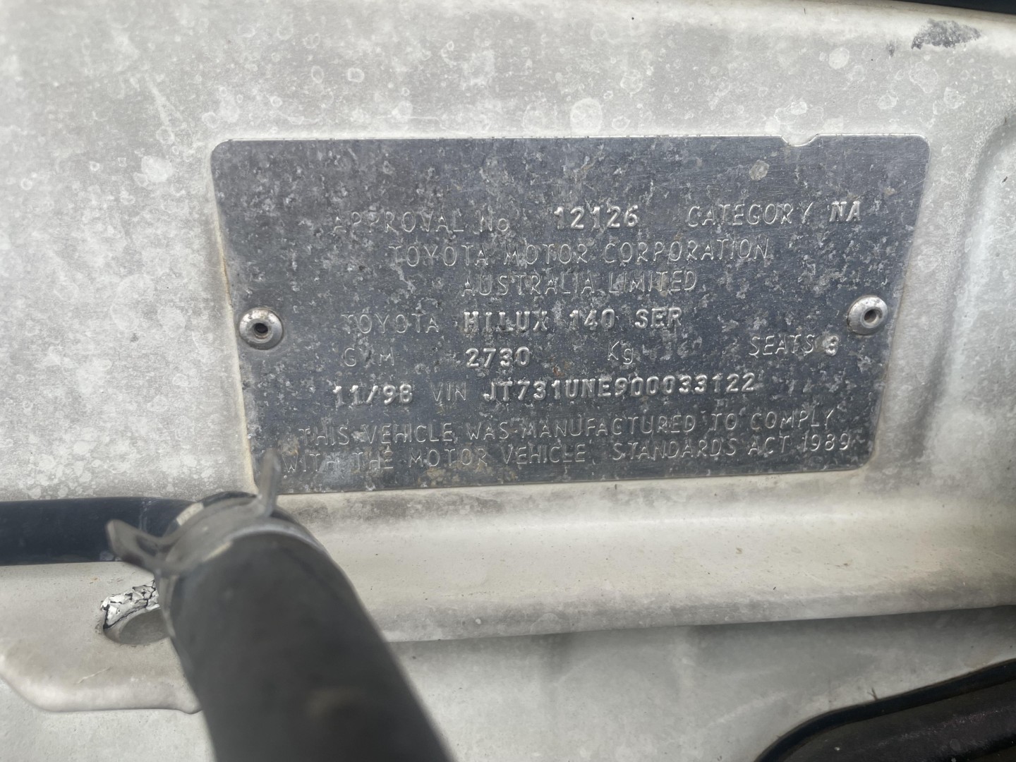 Lot 11. Toyota Hilux 2WD tray back Ute, 11/98 , sold unreg, indicating 328,680 kms, 3RZ 2.7lte petrol engine, alloy tray, towbar, runs but sold as is where is with no statutory warranty Vin JT731UNE900033122.