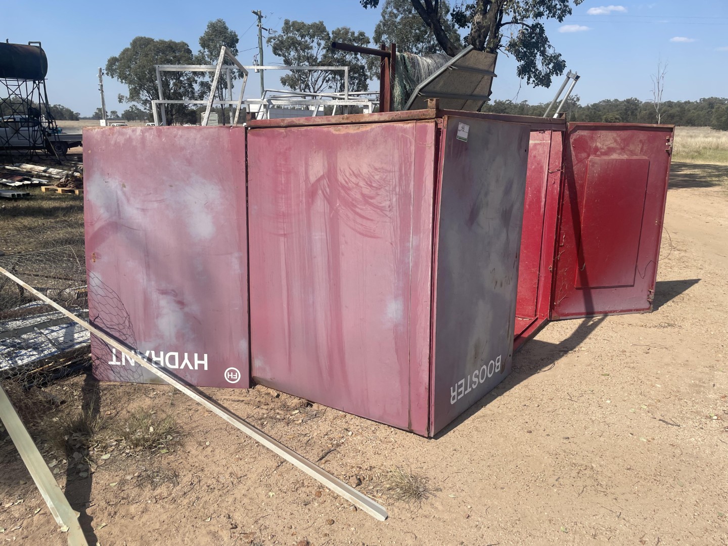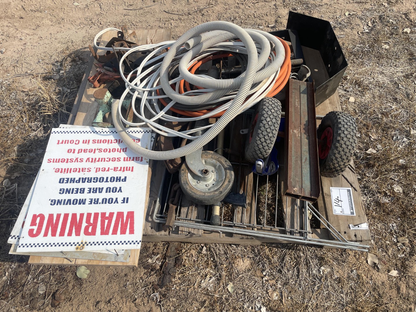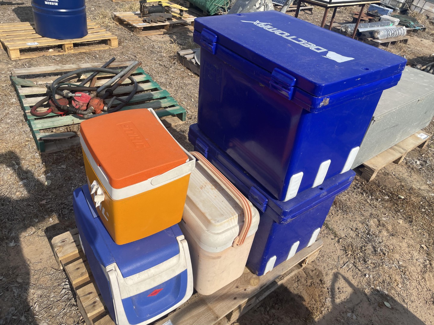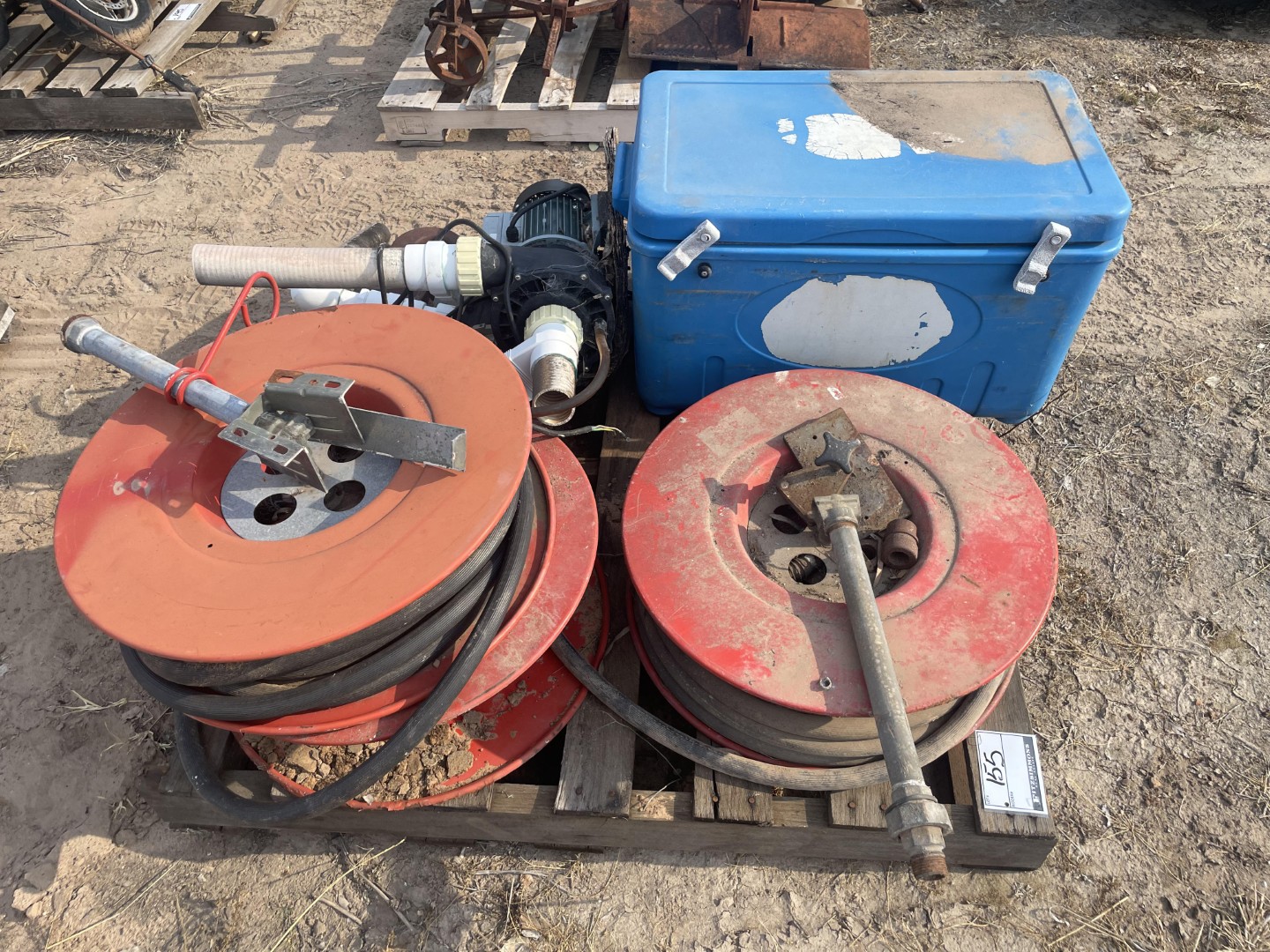 Lot 155. Fire Hose Reels, Blue esky, Large Pulley Block, Old pool pump (sold as is where is ,condition unknown, parts only).