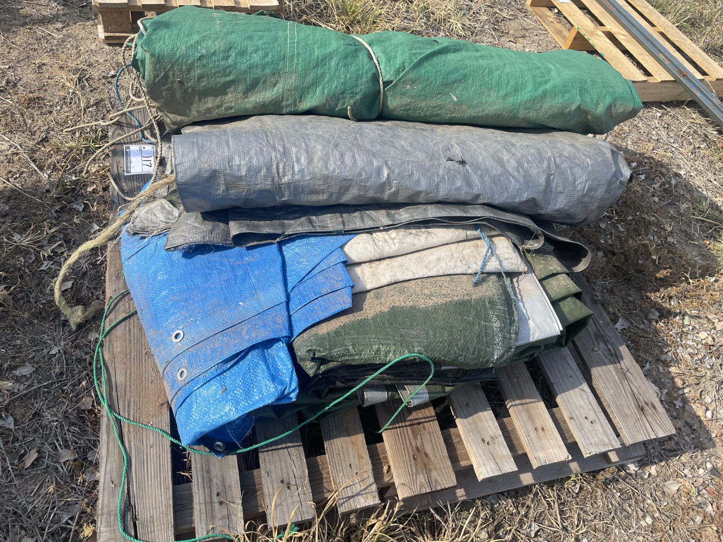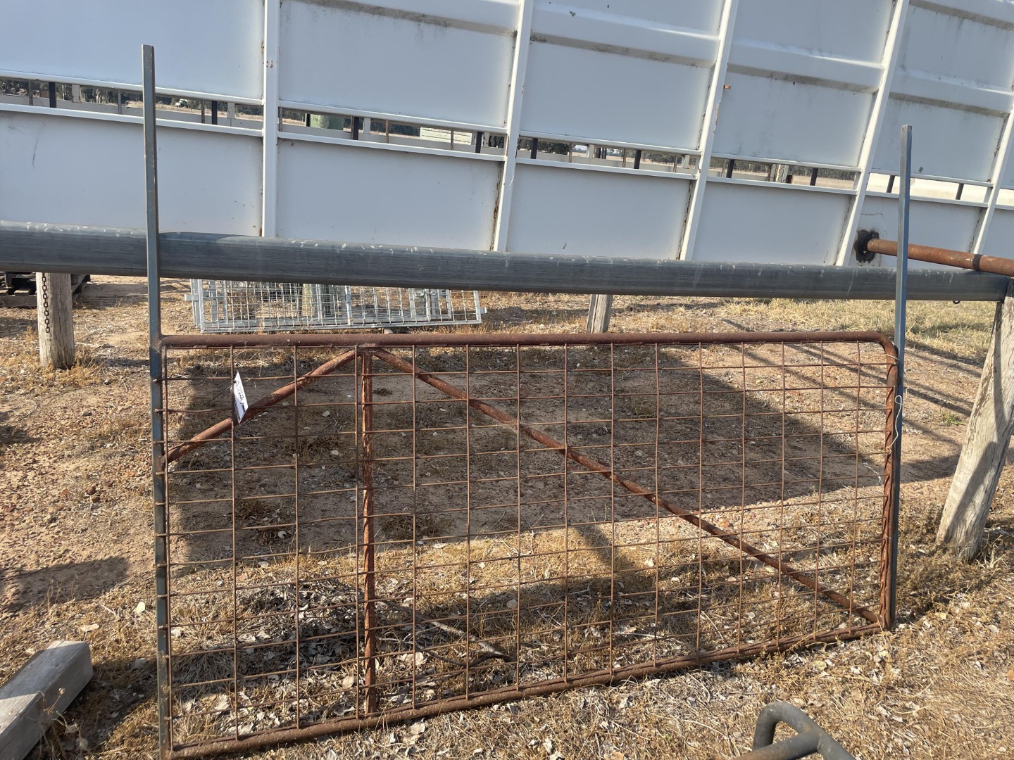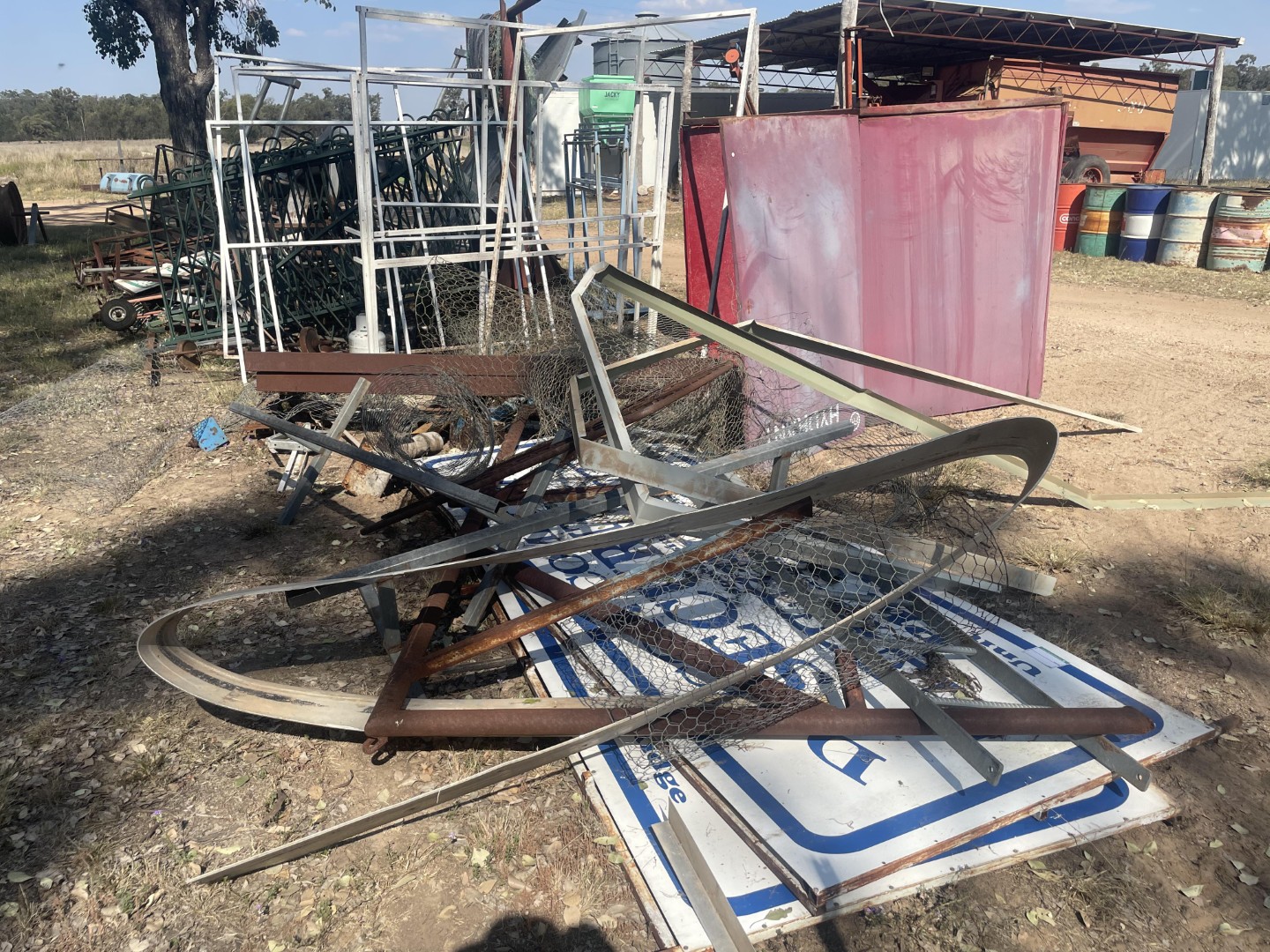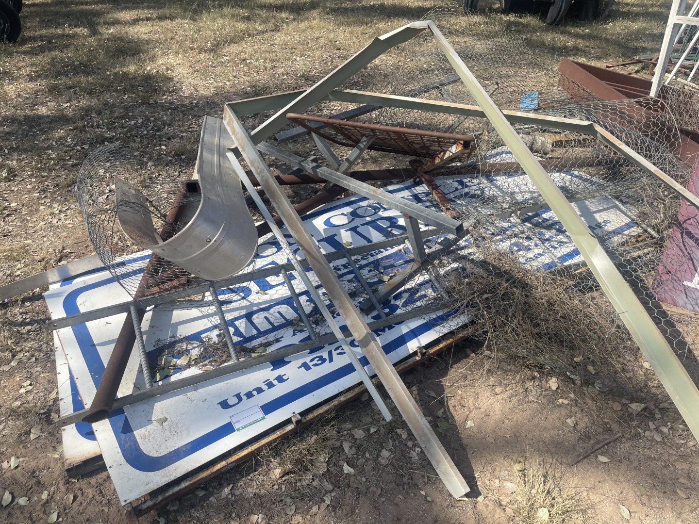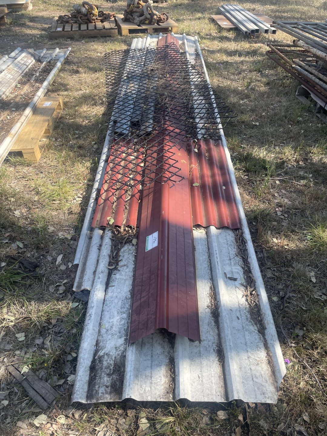 Lot 46. Sundry roofing iron, piece of alloy diamond mesh, few off cuts cattle rail.