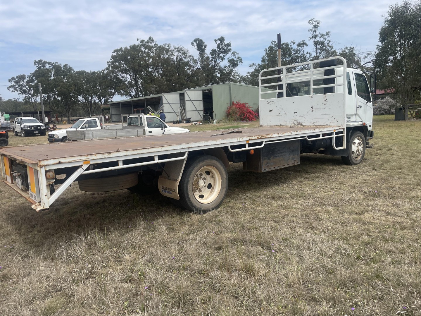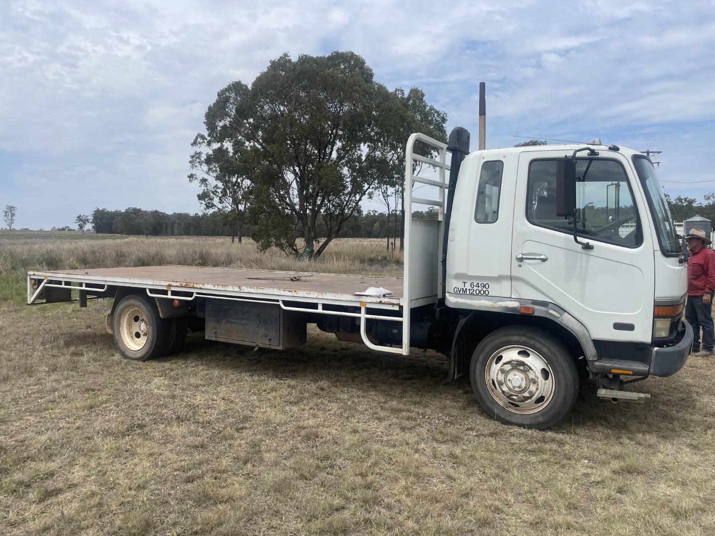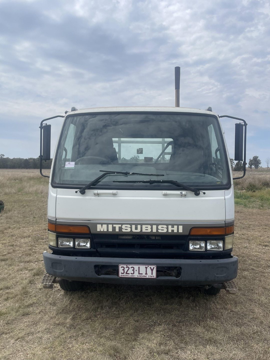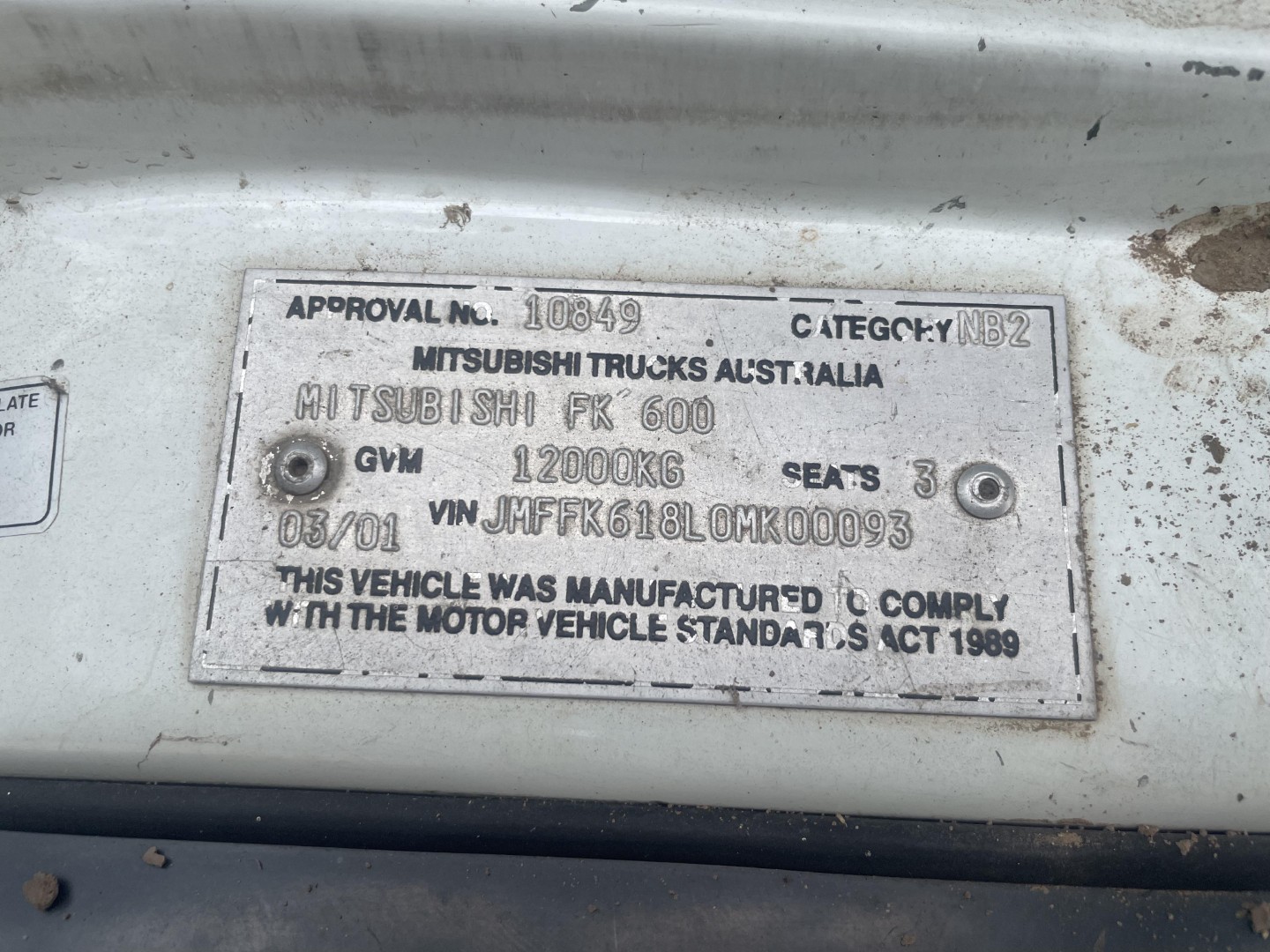 Lot 4. Mitsubishi FK 600 tray back truck with stock crate included, 03/2001 ,in good condition, model FK618LHRFAC, 285,000 kms, 12,000 GVM, steel tool box, Certificate of inspection will be current. Vin: JMFFK618L0MK00093.