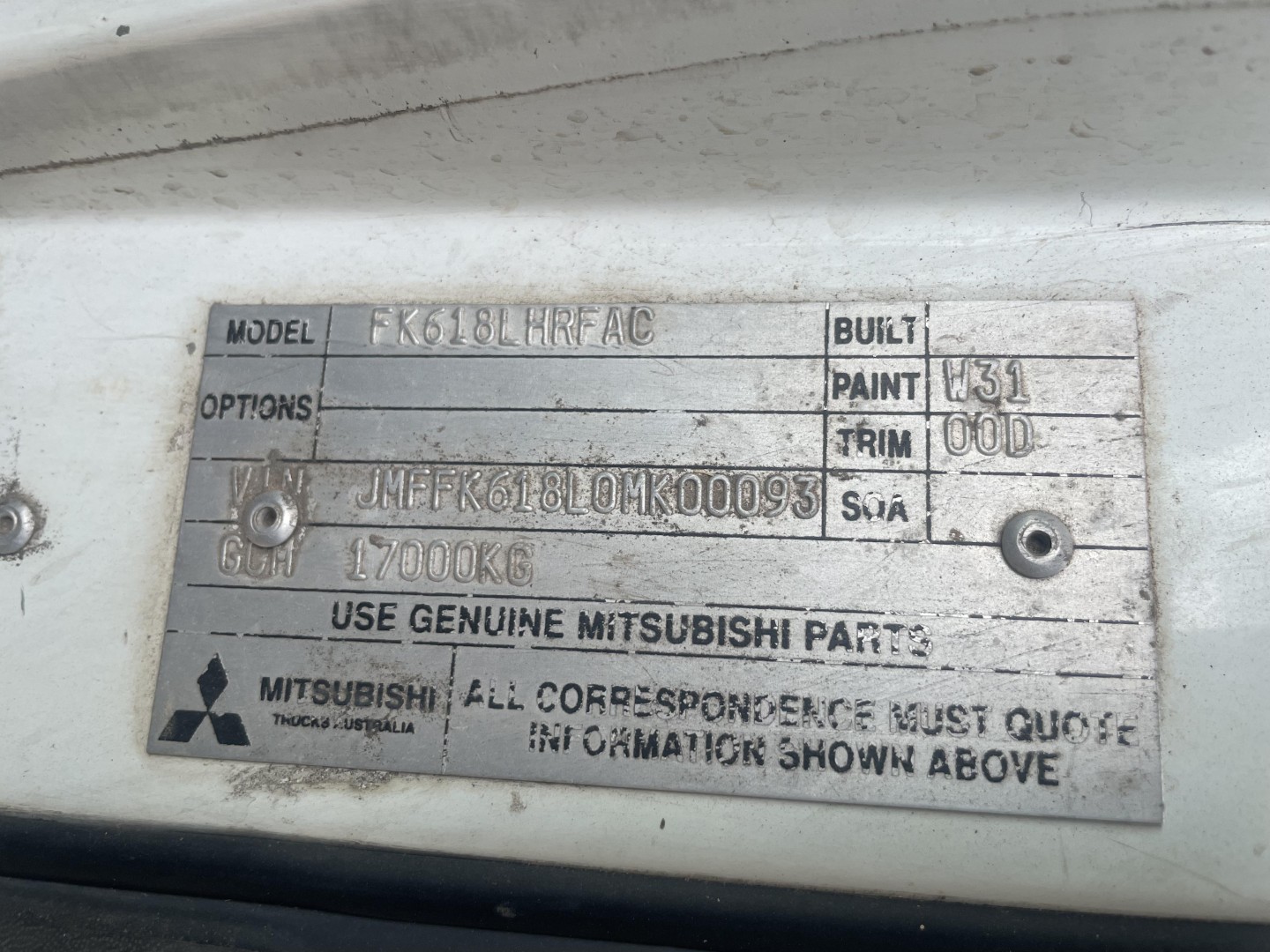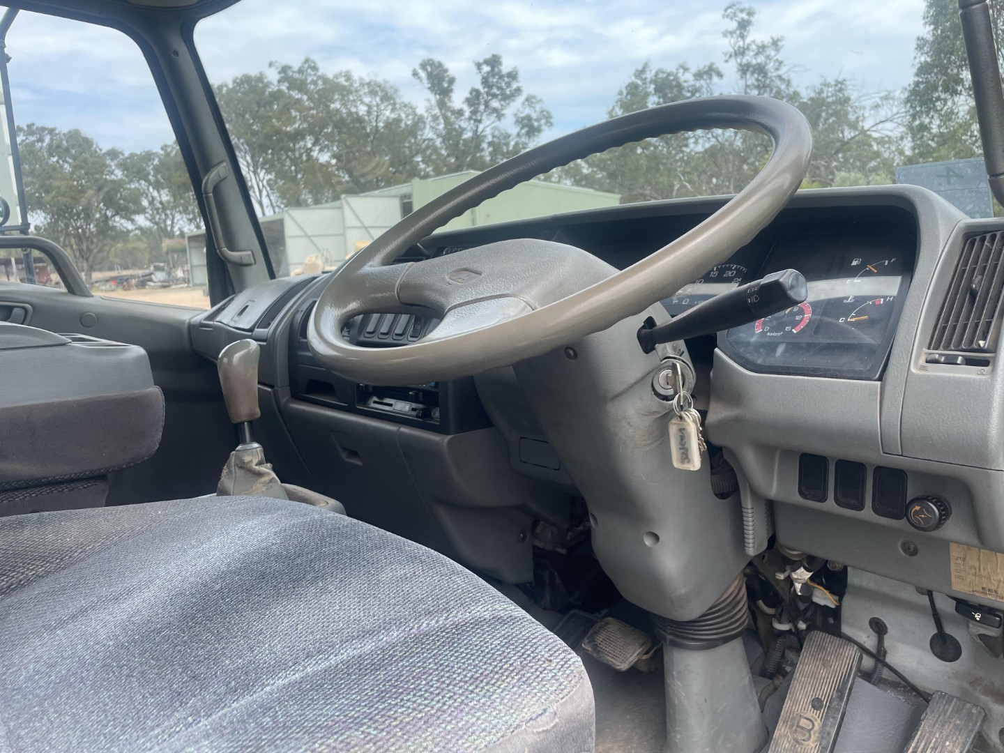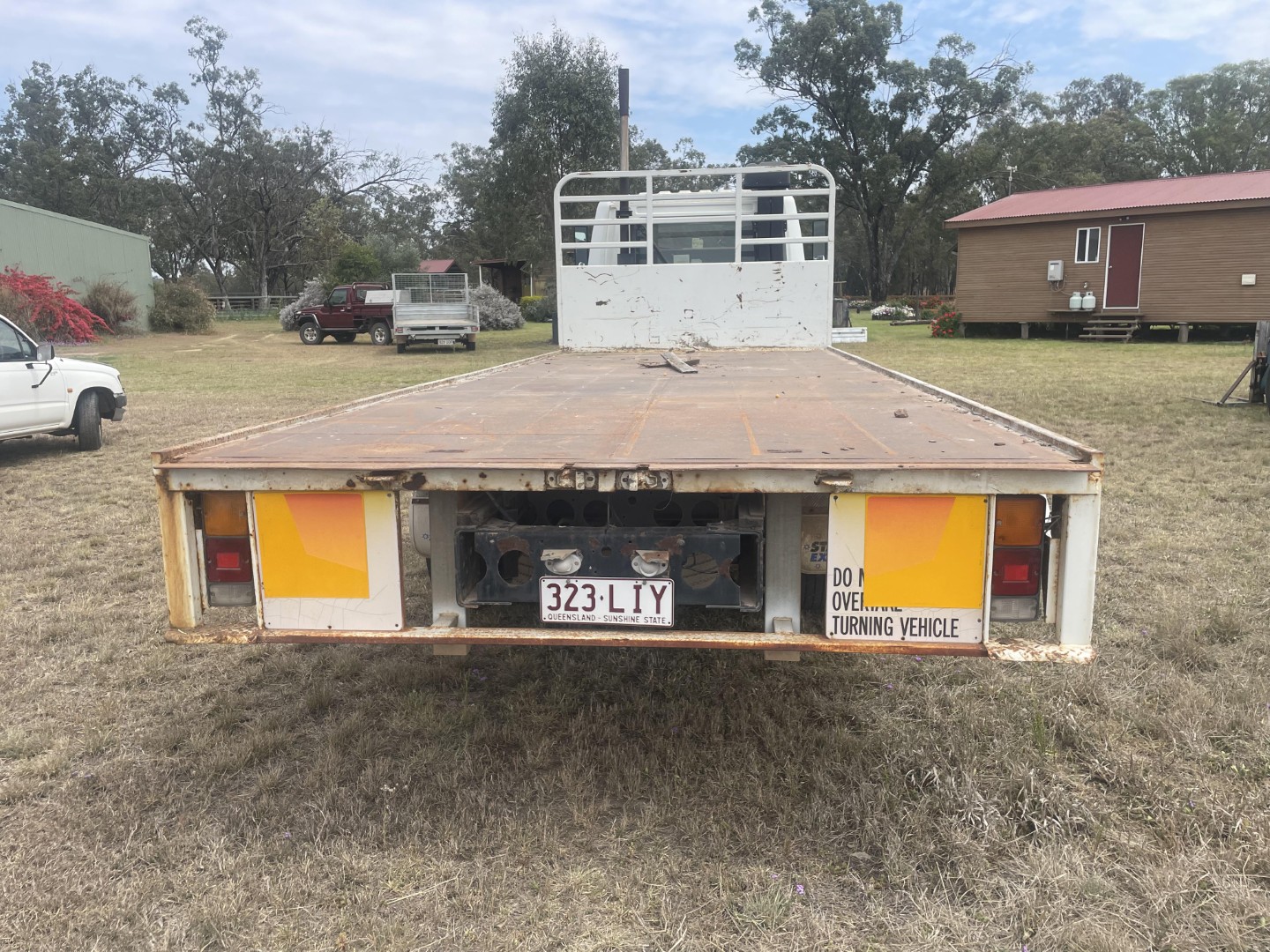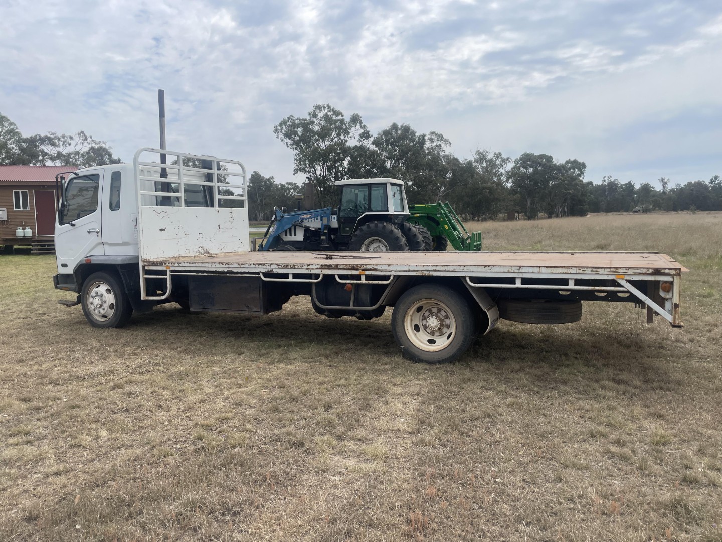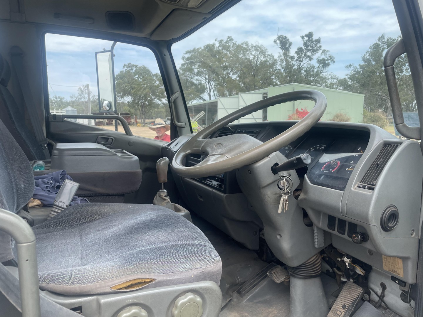 Lot 4. Mitsubishi FK 600 tray back truck with stock crate included, 03/2001 ,in good condition, model FK618LHRFAC, 285,000 kms, 12,000 GVM, steel tool box, Certificate of inspection will be current. Vin: JMFFK618L0MK00093.
