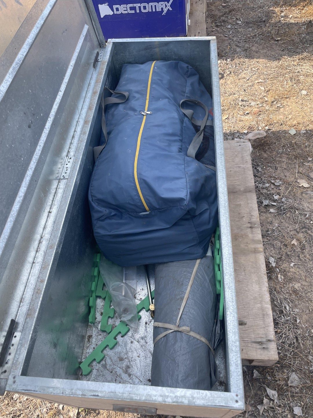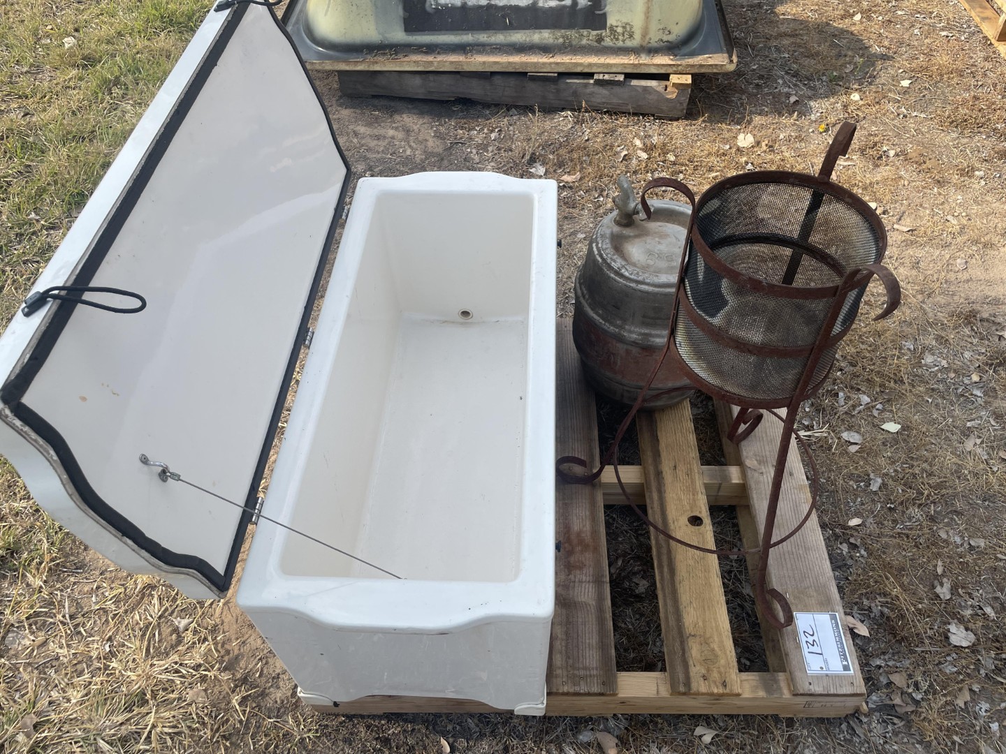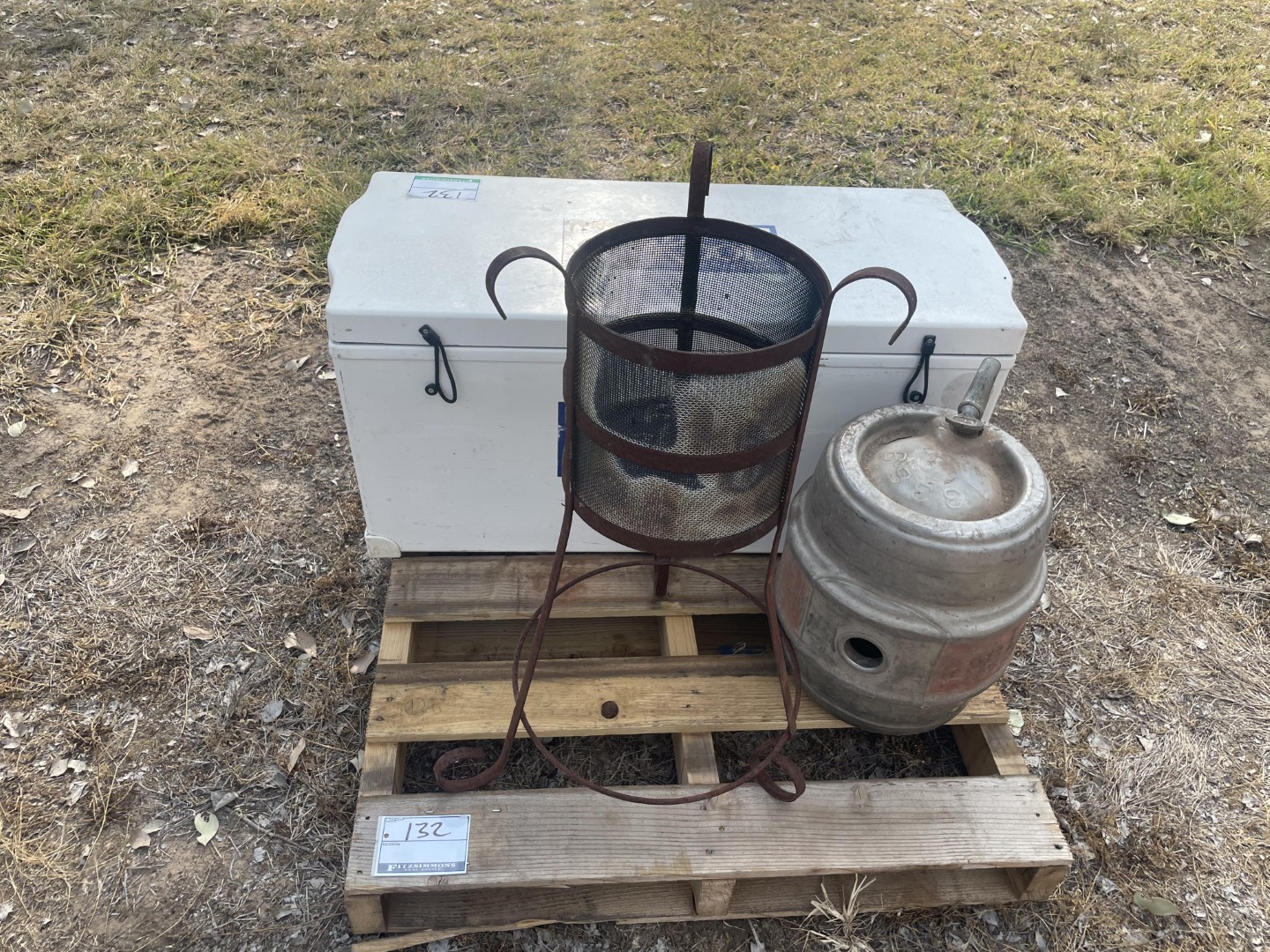 Lot 132. Evakool Esky, old keg with tap, fire basket.