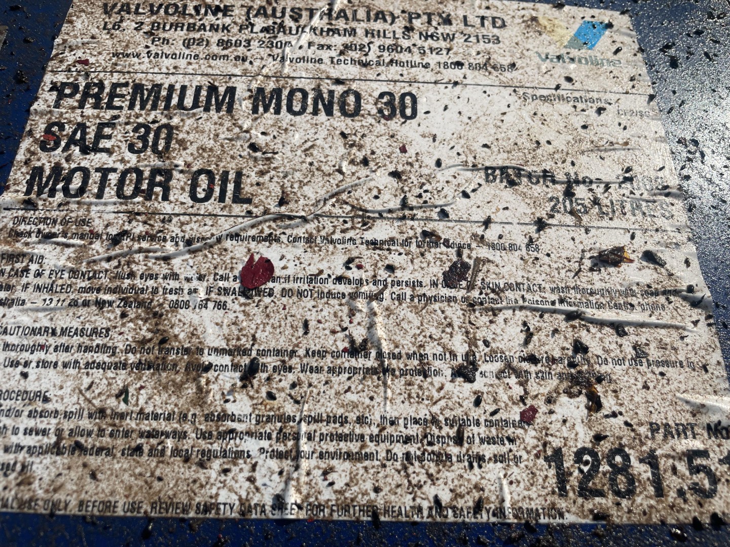 Lot 128. Drum of 30 weight engine oil approx. ½ full.