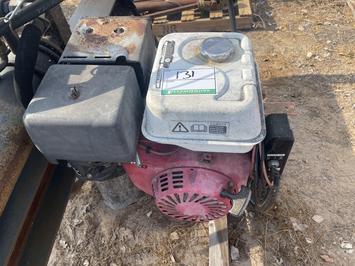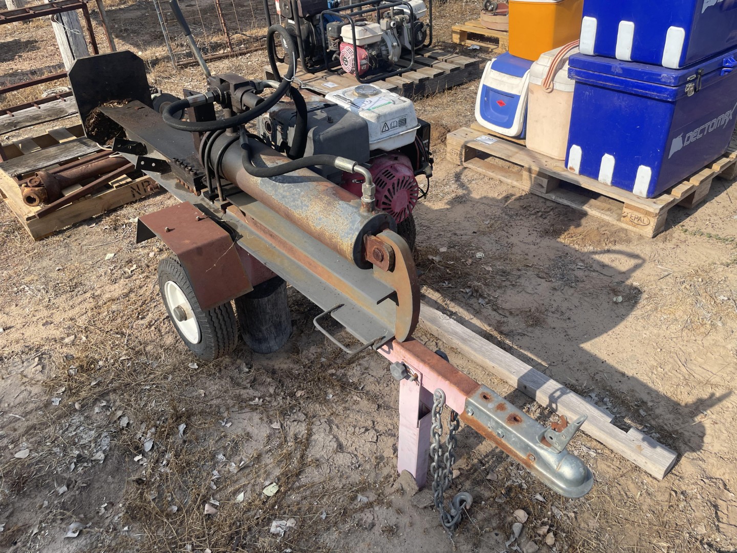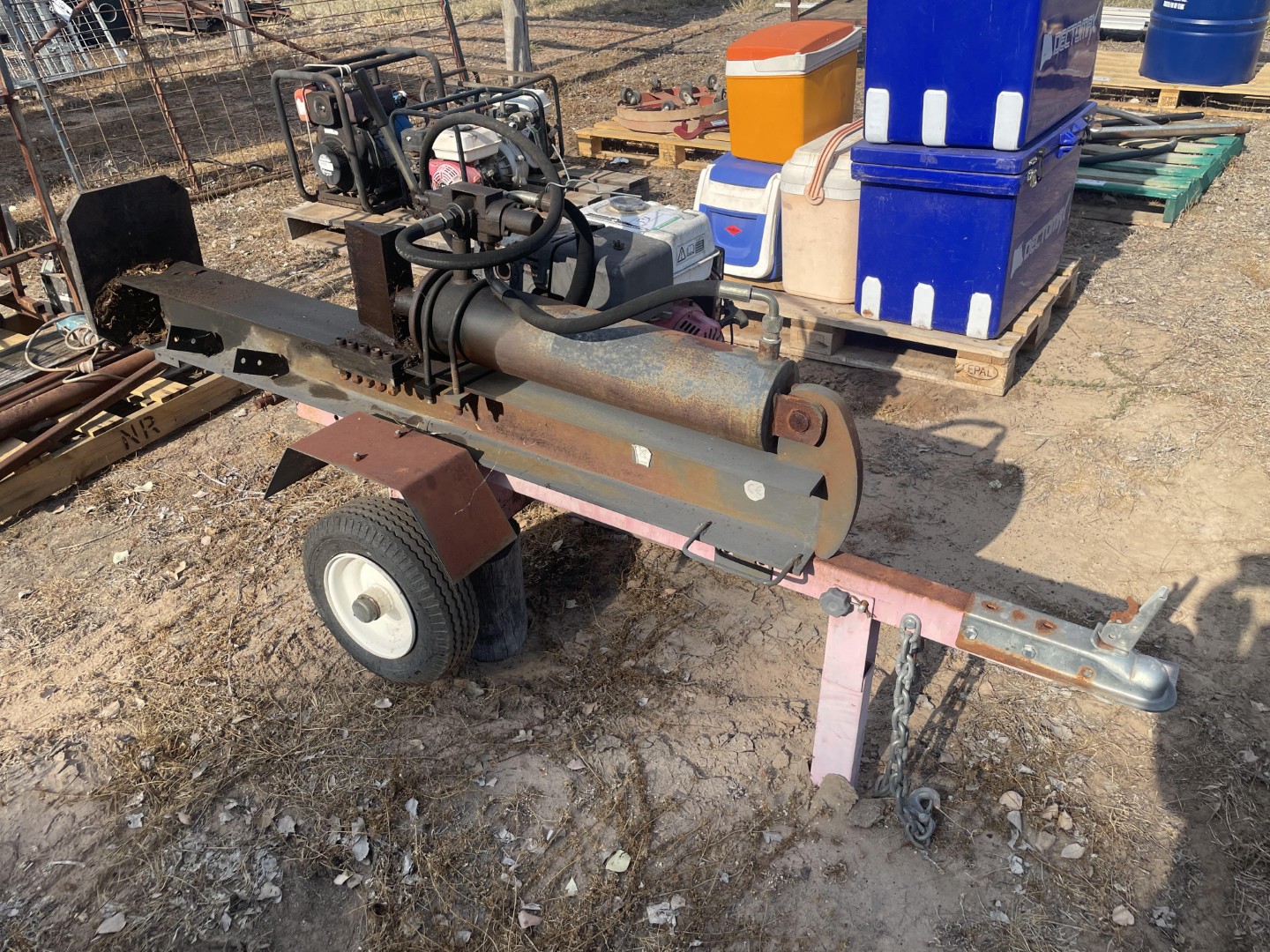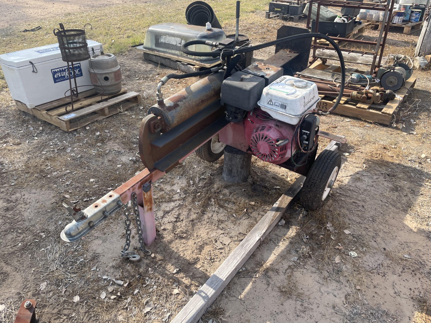 Lot 131. Wood Splitter, Honda engine powering hydraulic motor on trailer frame, motor has electric start (no battery supplied), owner has been pull starting, good goer.