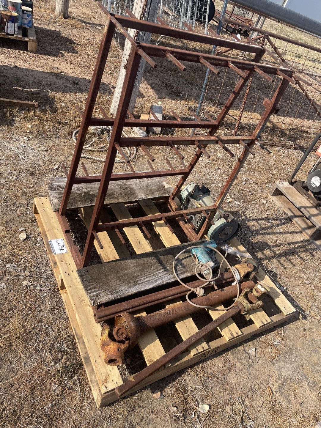 Lot 134. Double end Bench Grinder, Electric Drill (sold as is where is ,may not run), Small stand , 3 x PTO shafts.