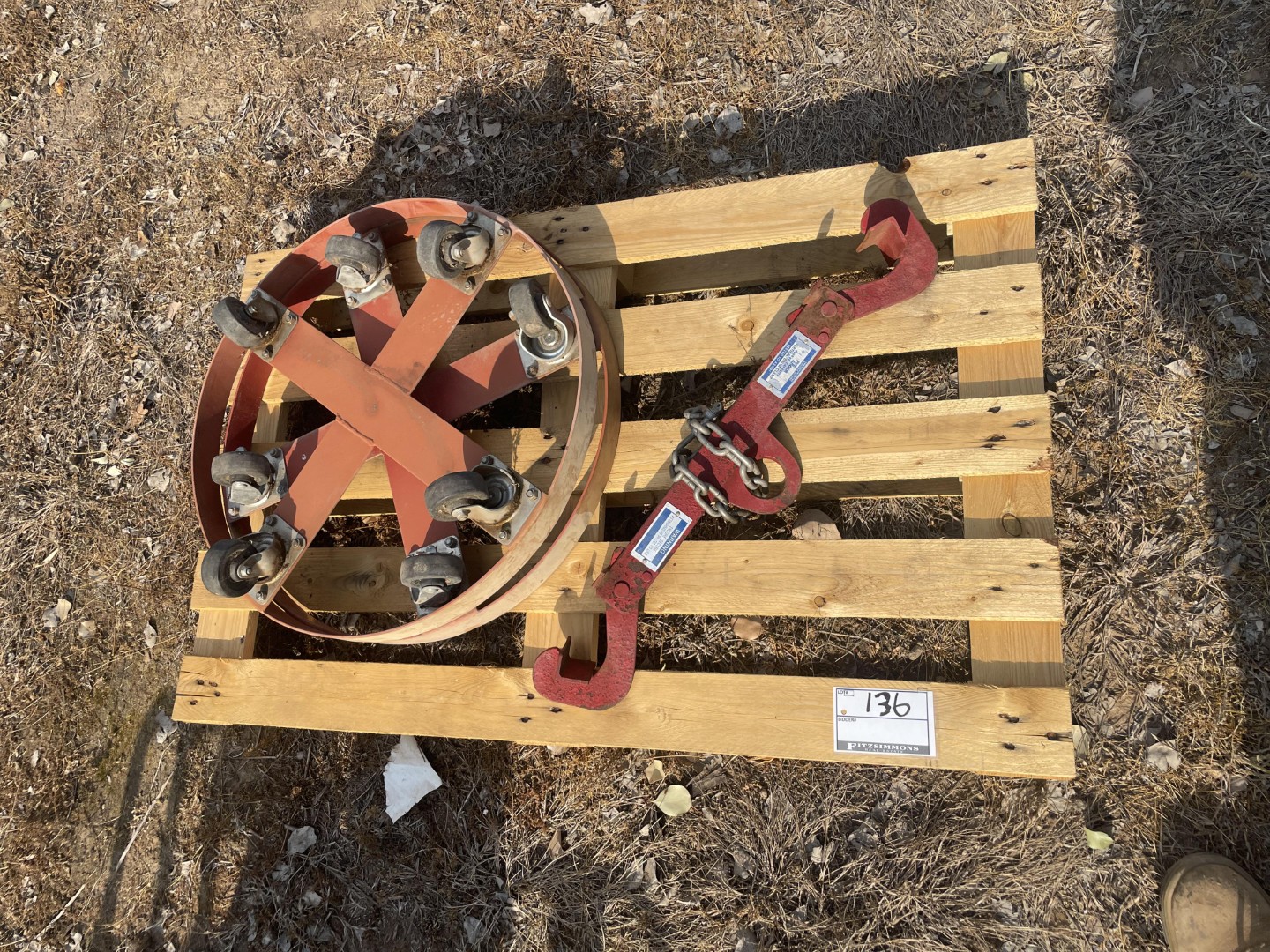 Lot 136. Vertical Drum Clamp and 2 x drum trolleys.