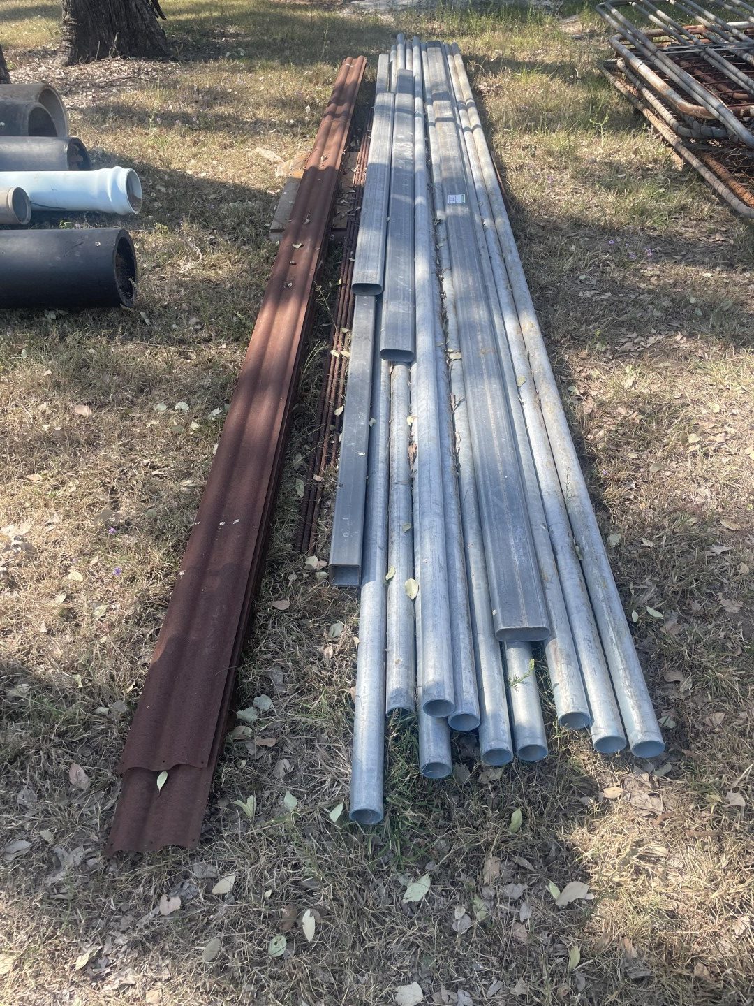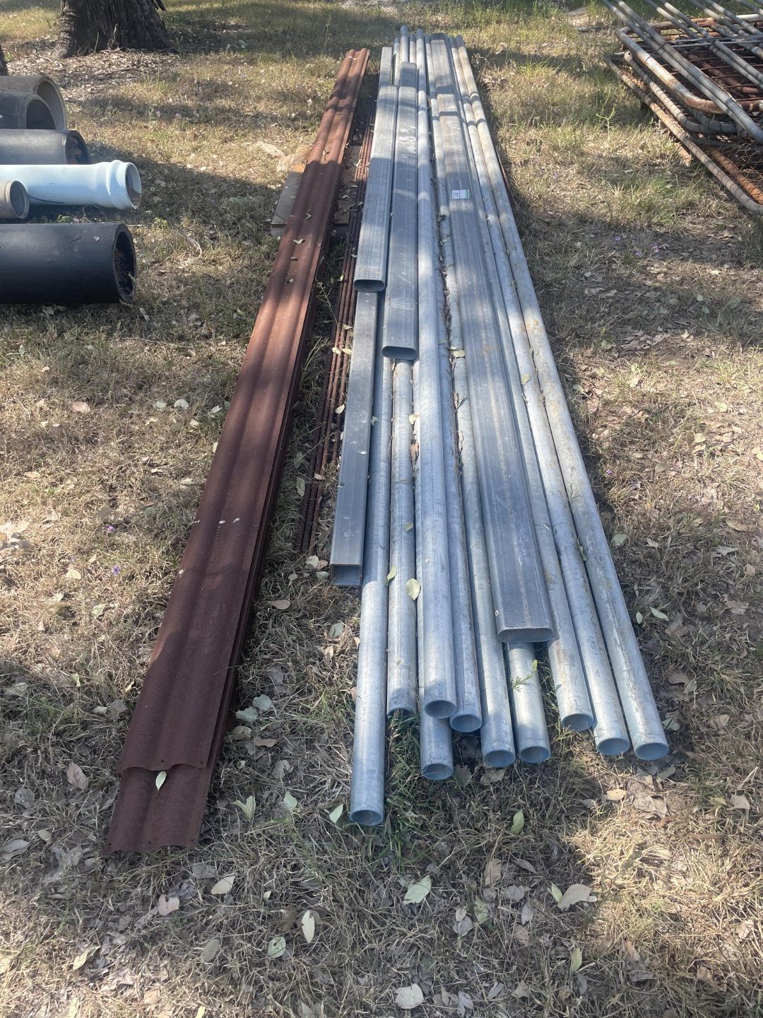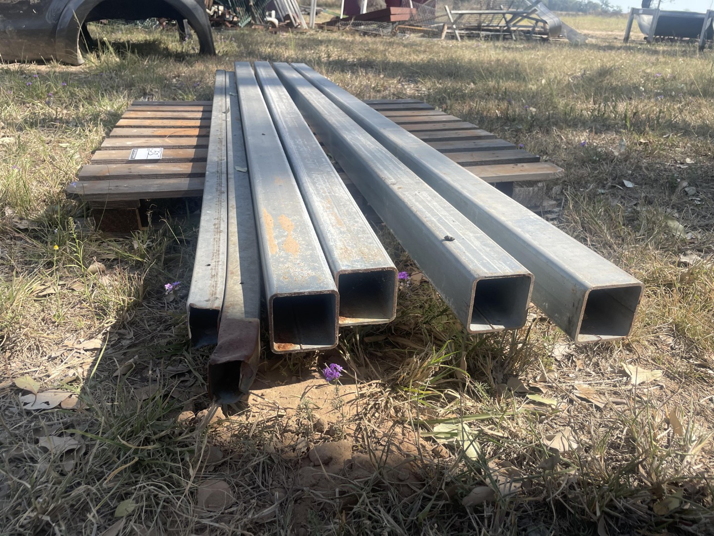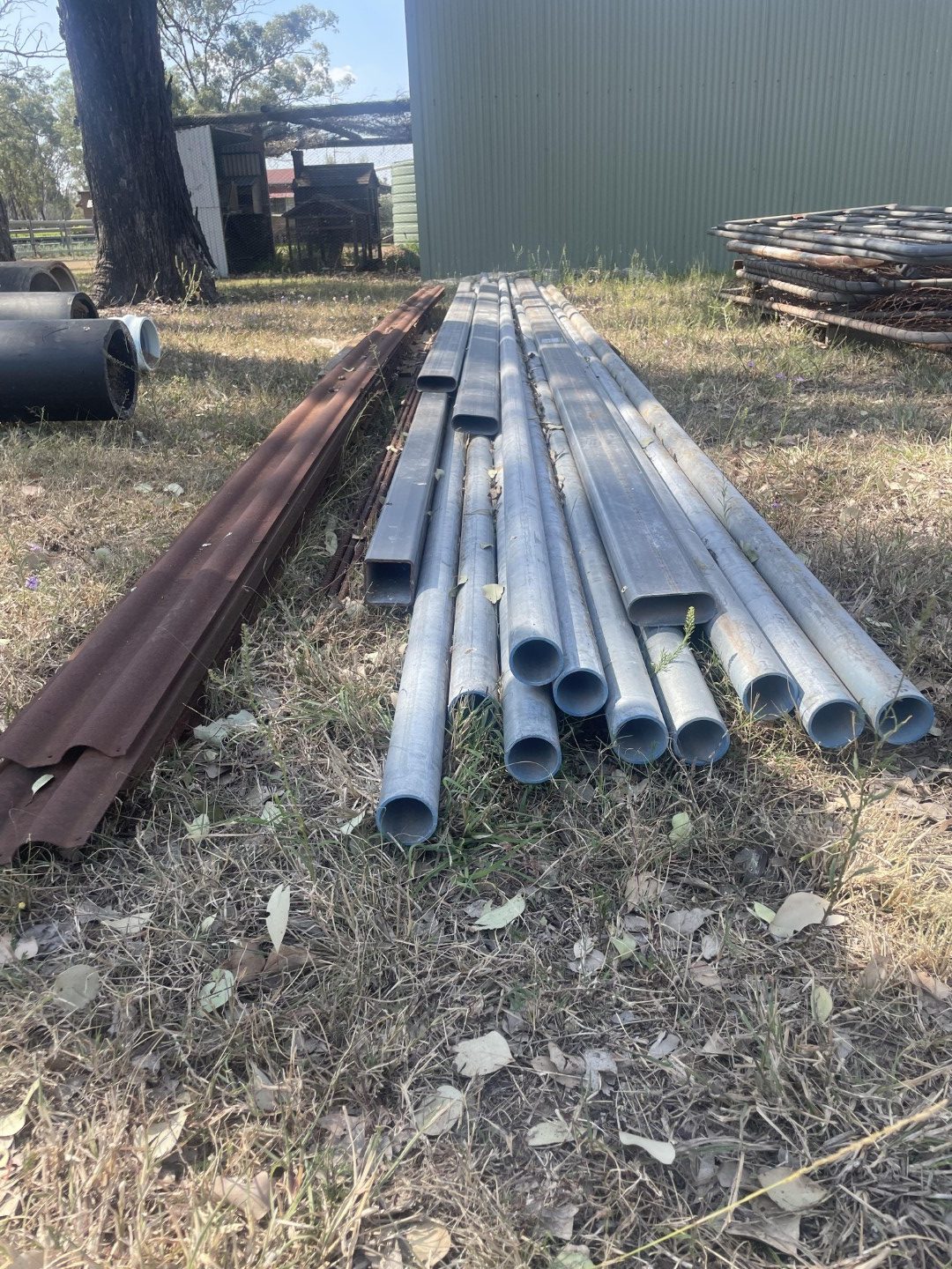 Lot 44. 10 x lengths Galv pipe 60mm OD with blue ends – 3 pieces oval cattle rail – SHS 1@ 75 x 75 x 5.4m (green end) – sundry reo – sundry black steel stock panel.