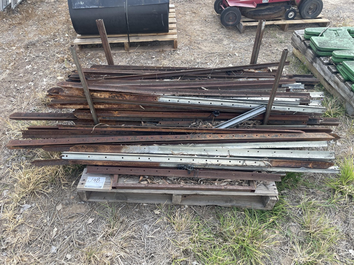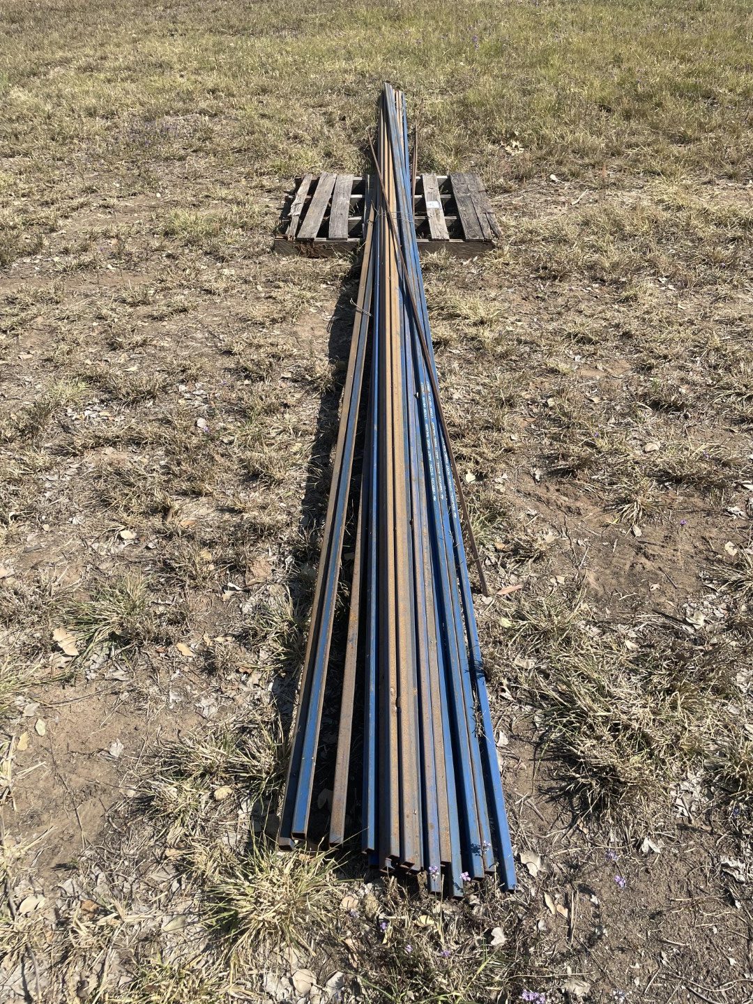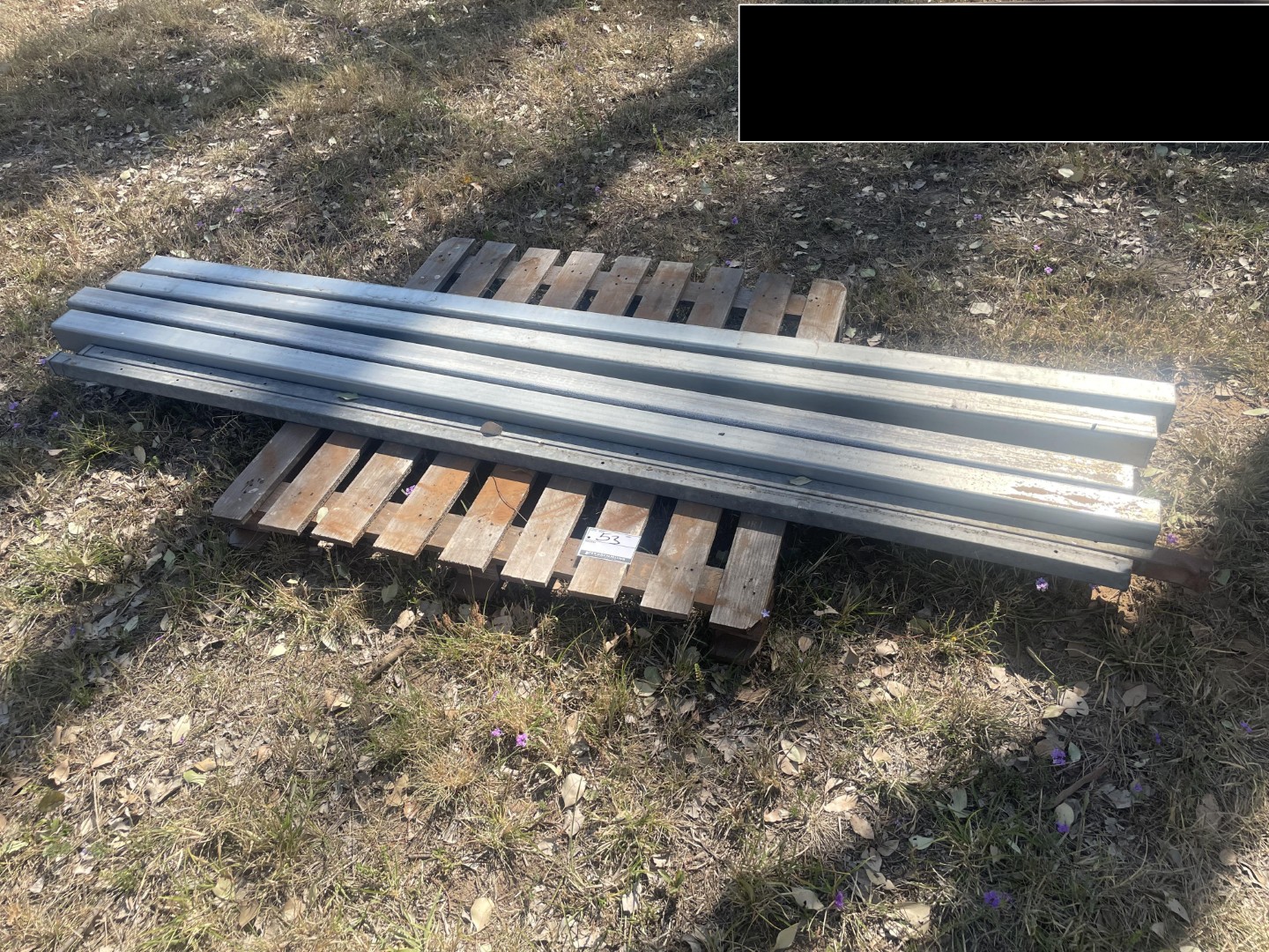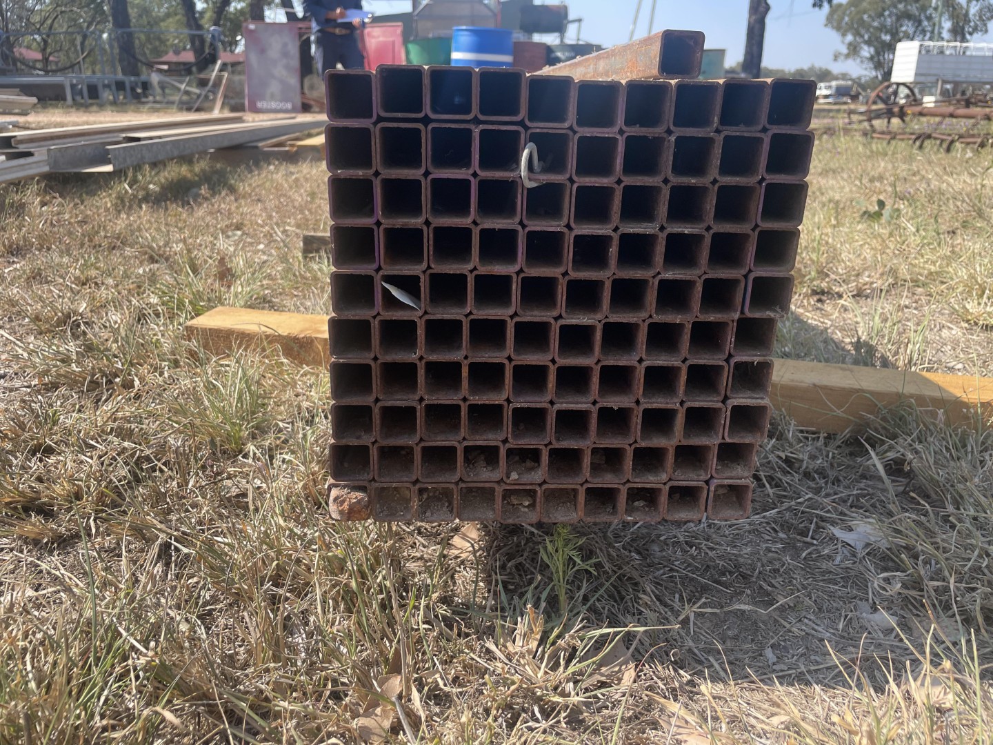 Lot 44. 10 x lengths Galv pipe 60mm OD with blue ends – 3 pieces oval cattle rail – SHS 1@ 75 x 75 x 5.4m (green end) – sundry reo – sundry black steel stock panel.