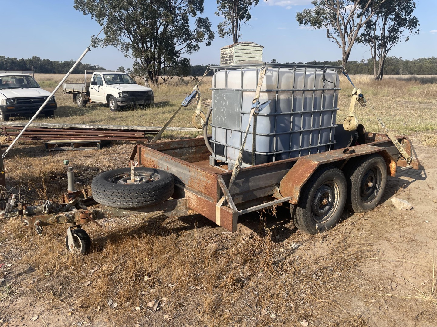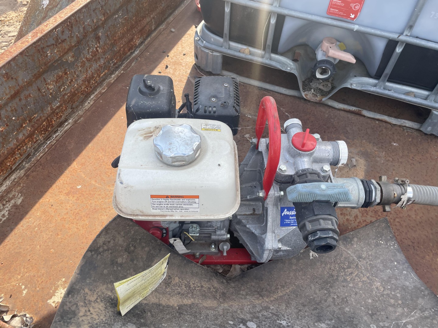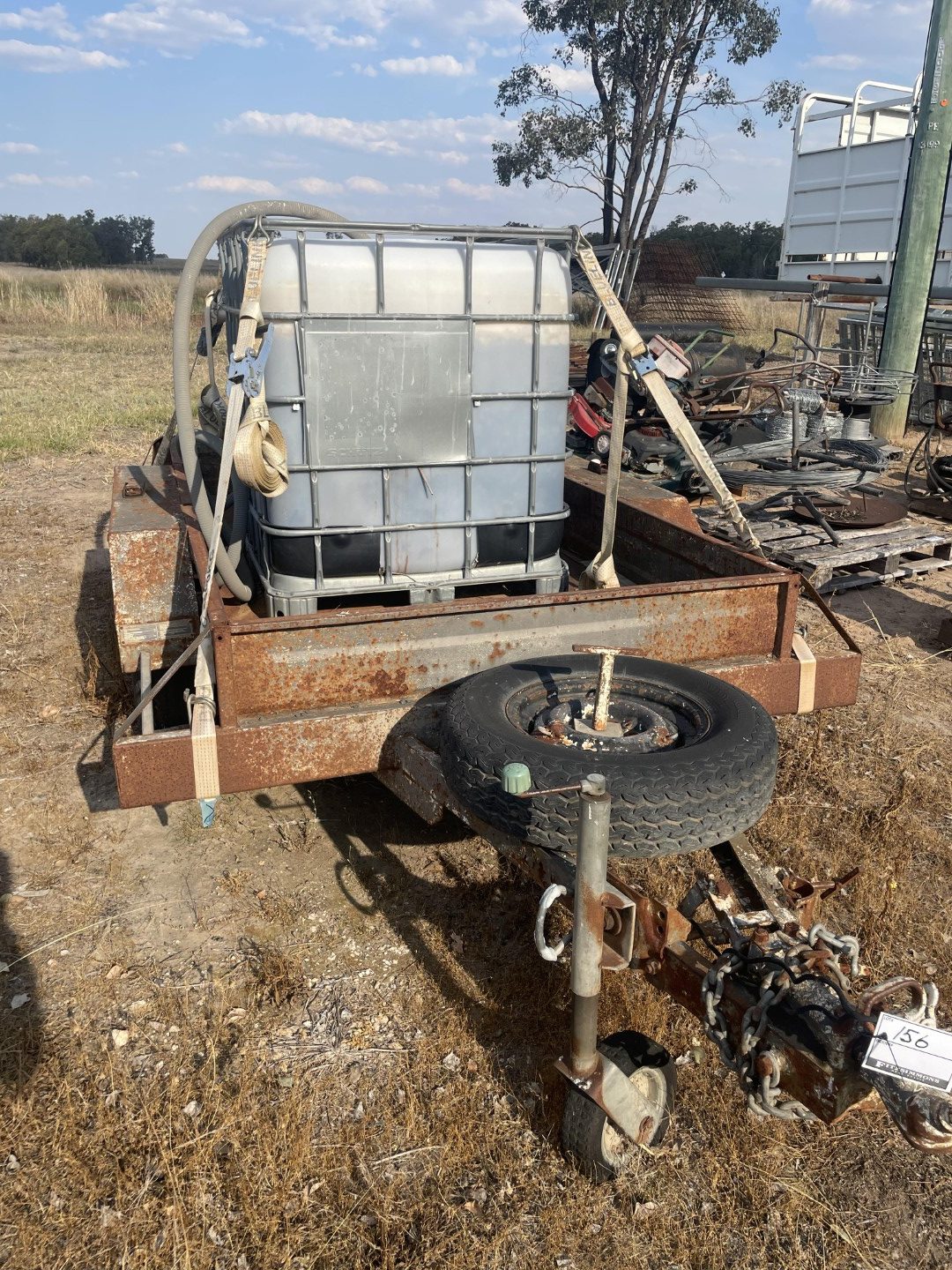 Lot 156. Tandem trailer set up as firefighting unit, approx. 3m x 1.5m, some rust, 1000 litre shuttle, Honda GX 160 pump goes well.