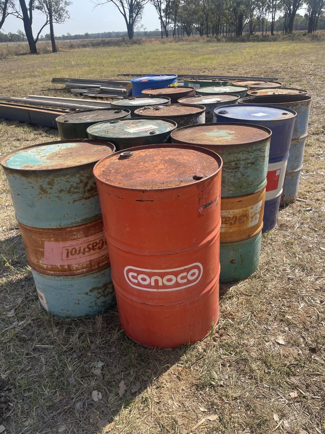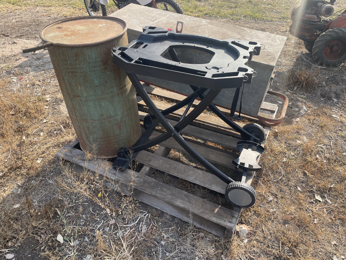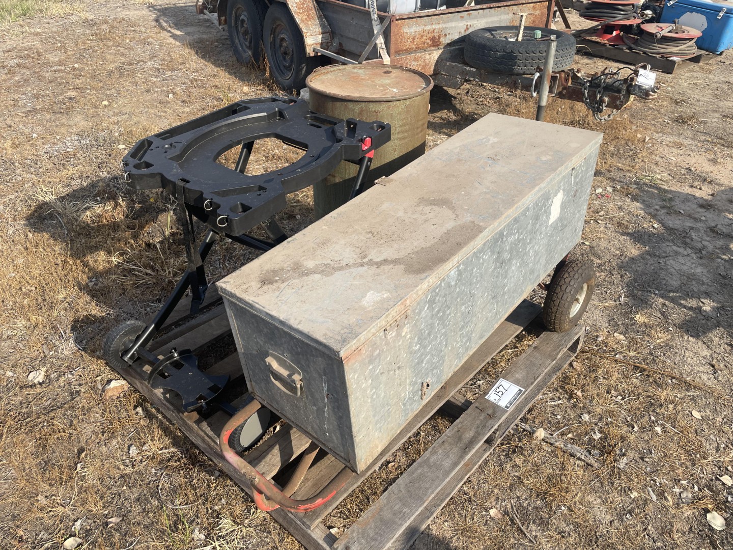 Lot 157. Steel Tool Box mounted on trolley, Old Drum with clamp lid, BBQ stand.
