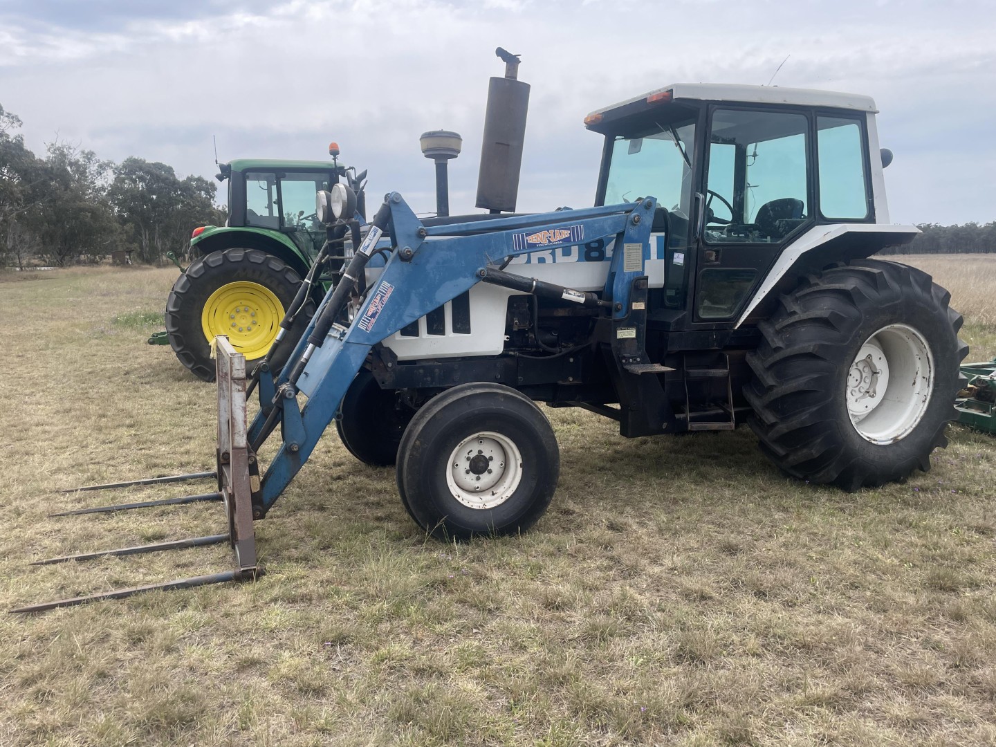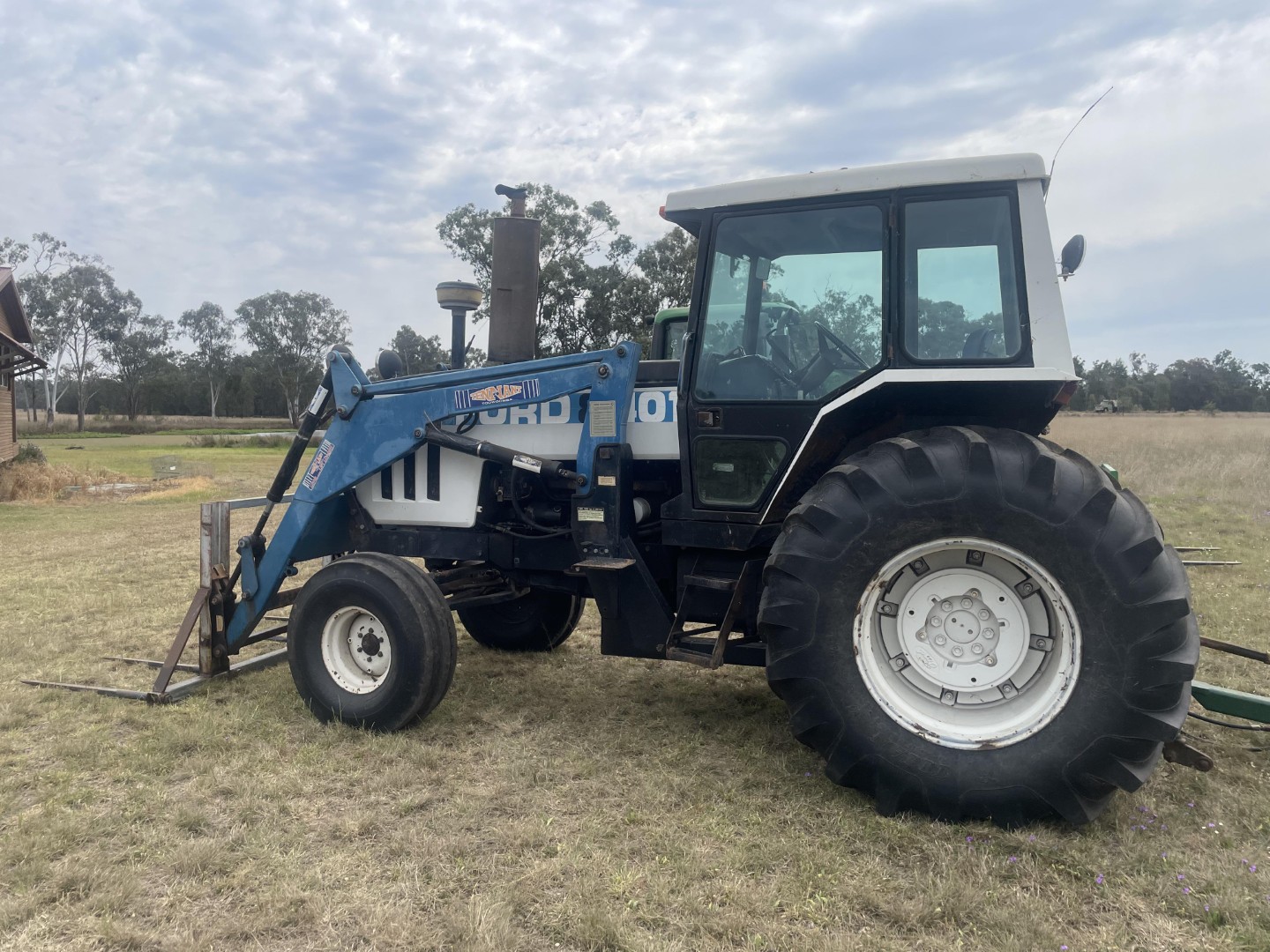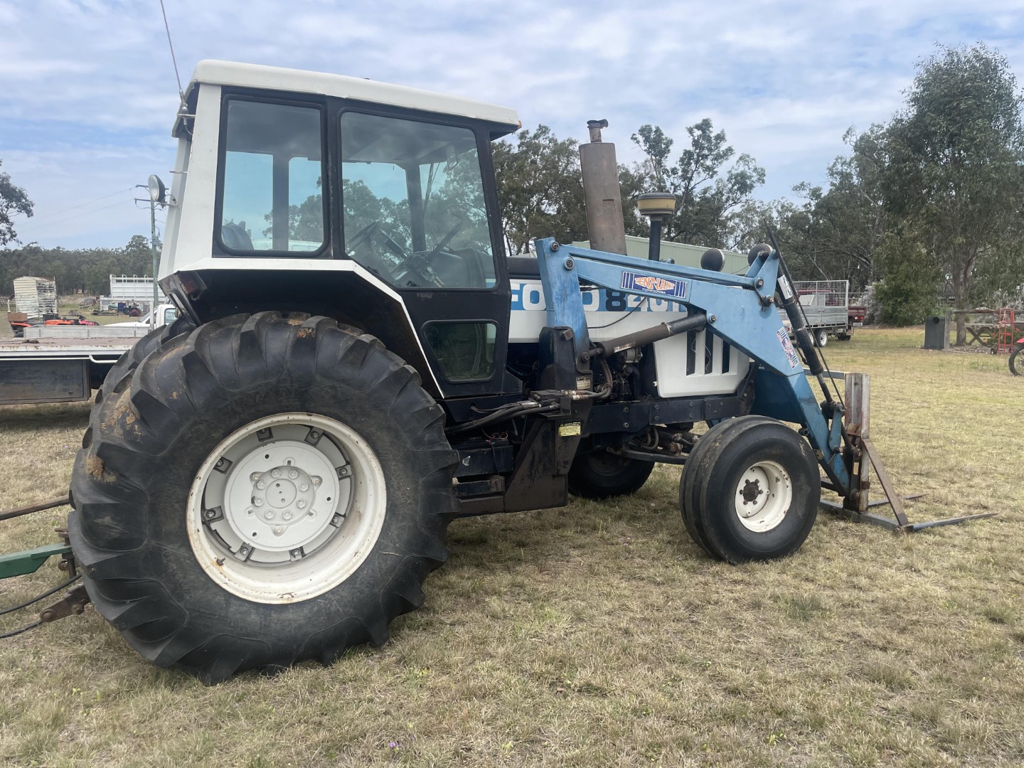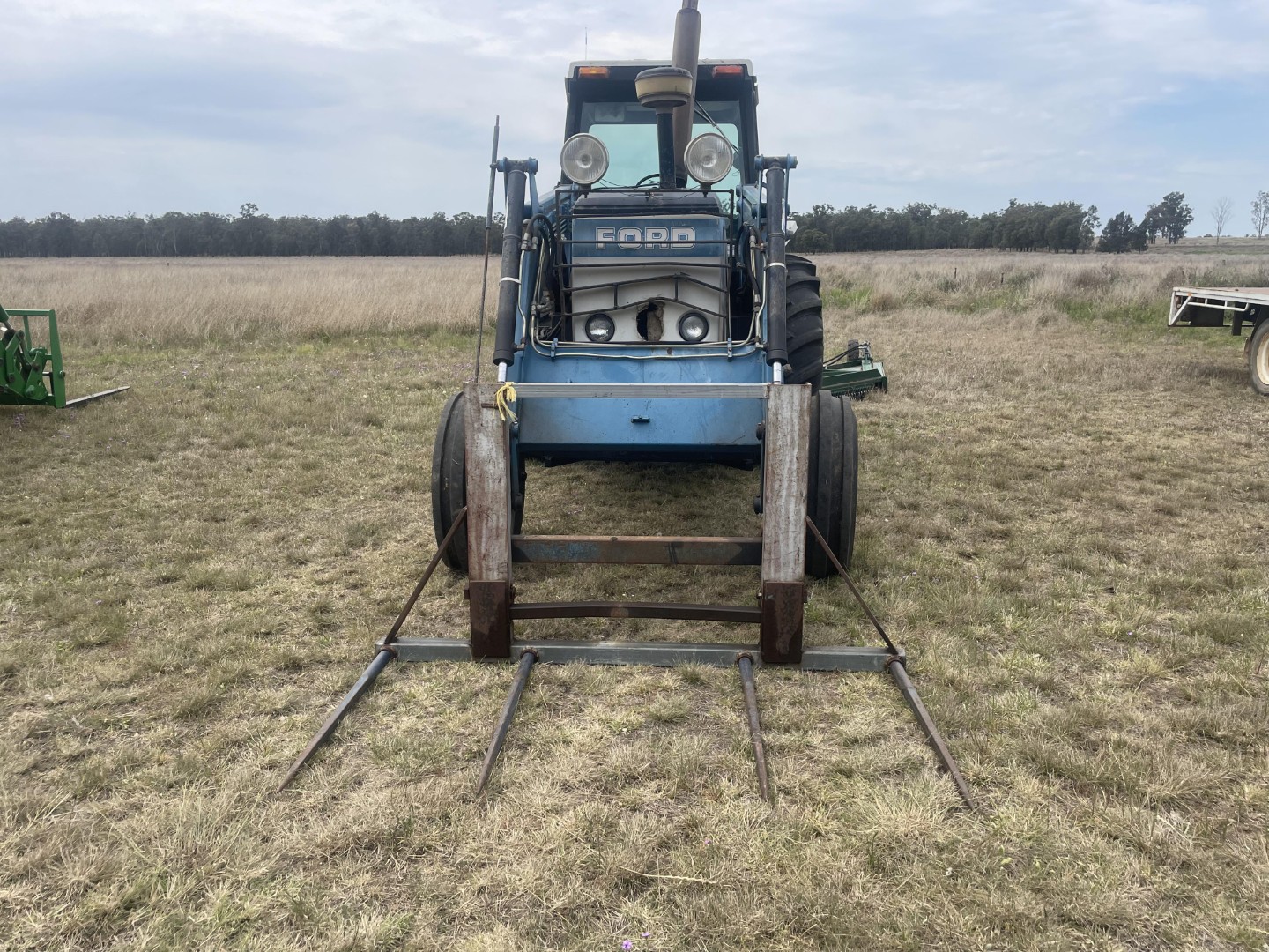Lot 2. Ford 8401 Tractor, air cond. cab, good rubber, 3PL, indicating 10,545 hours, hay spears and GP bucket. Serial No: B377845.