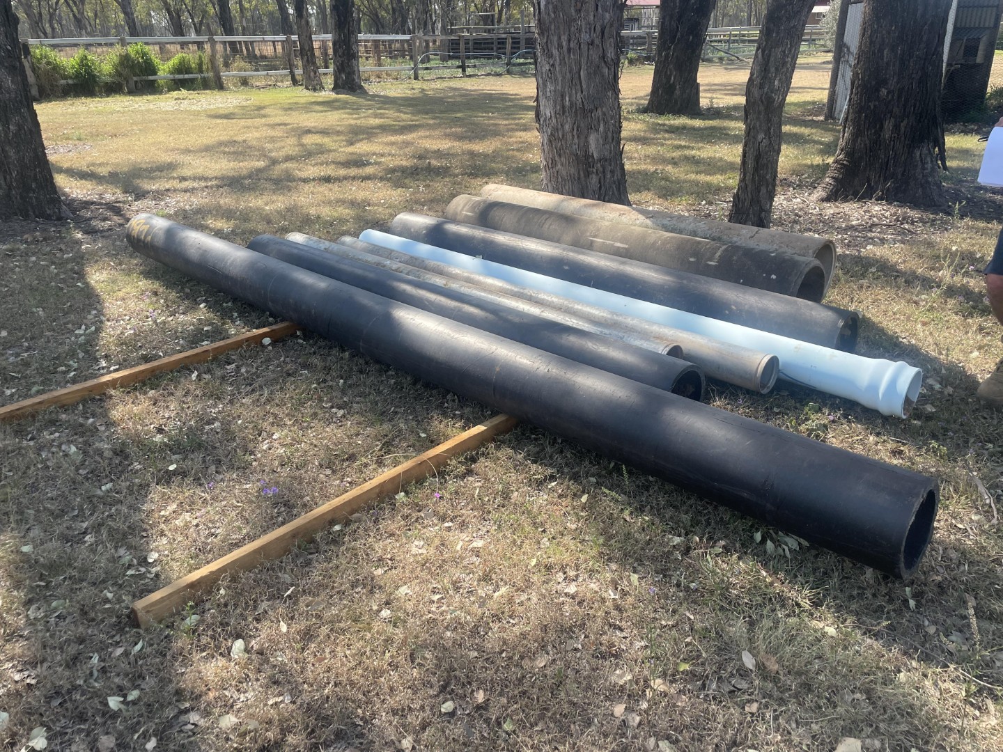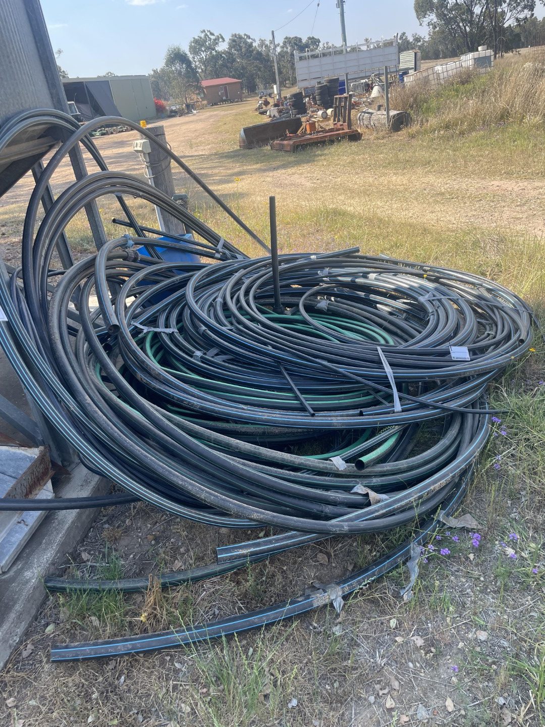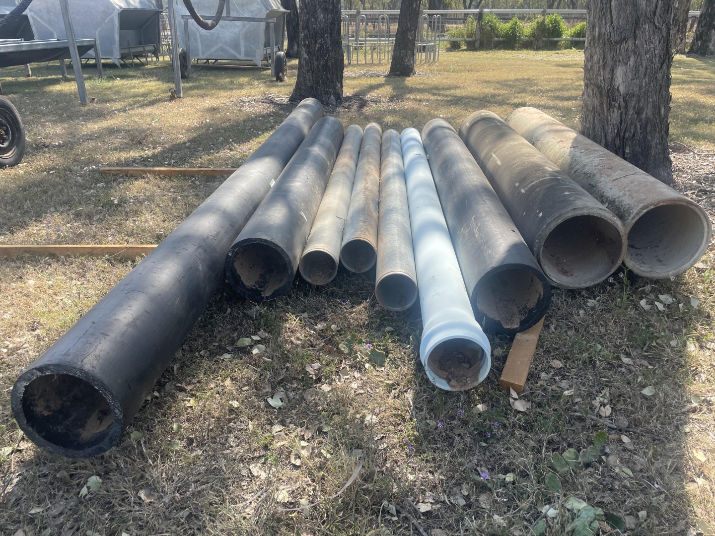 Lot 43. Qty pipe including heavy black poly pipe- 1 @ 4.9m,1@ 2.9m,1@ 3m / 2 x concrete pipes -2 @2.4m (360mm diameter) / 3 x Galv pipe @3m, approx. 3m long (160mm OD).
