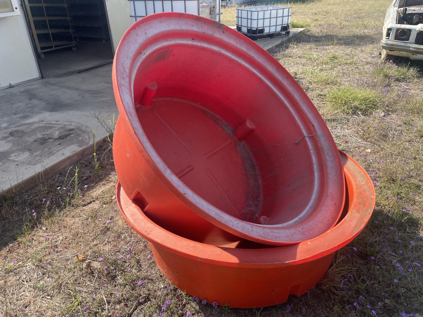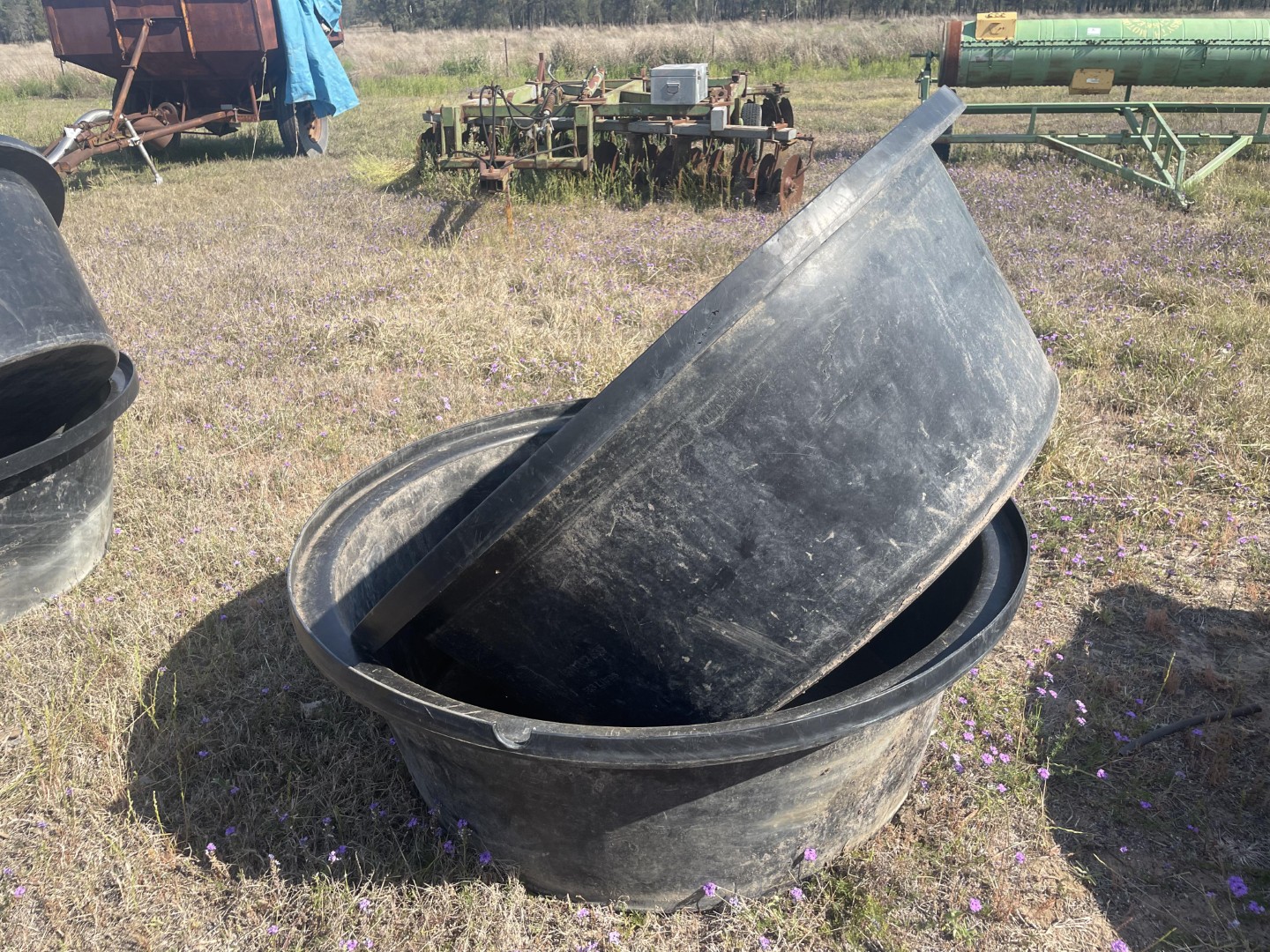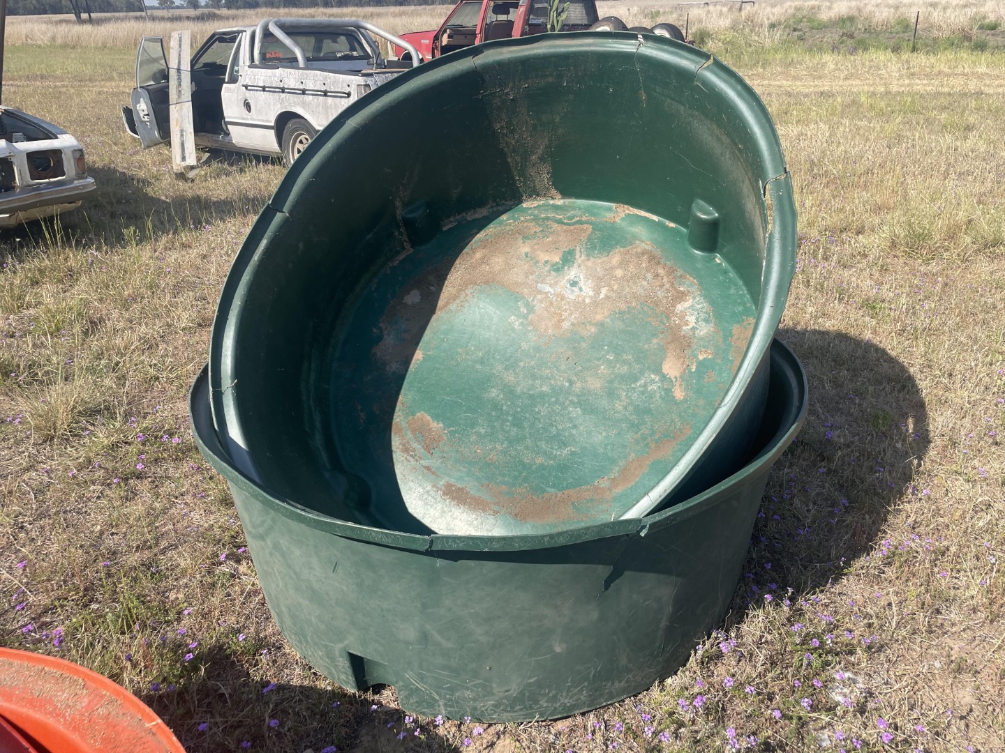 Lot 69. 2 x green poly round troughs with some cracks and damage at tops (inspection recommended).