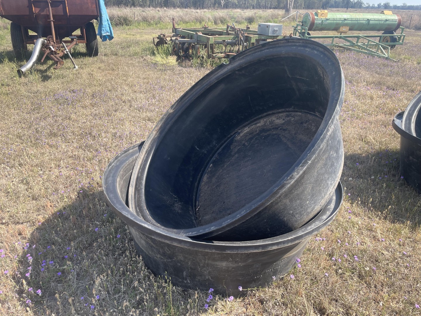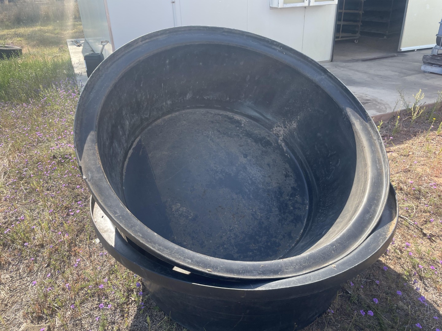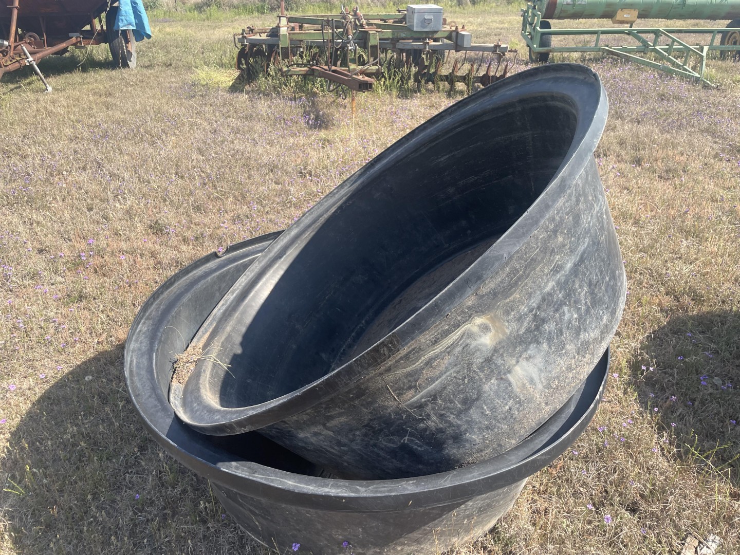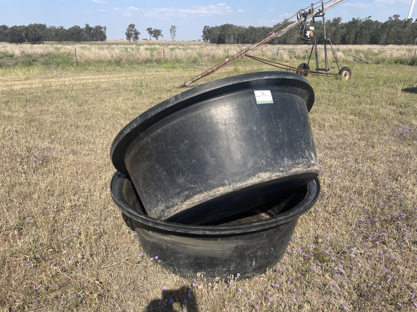 Lot 69. 2 x green poly round troughs with some cracks and damage at tops (inspection recommended).