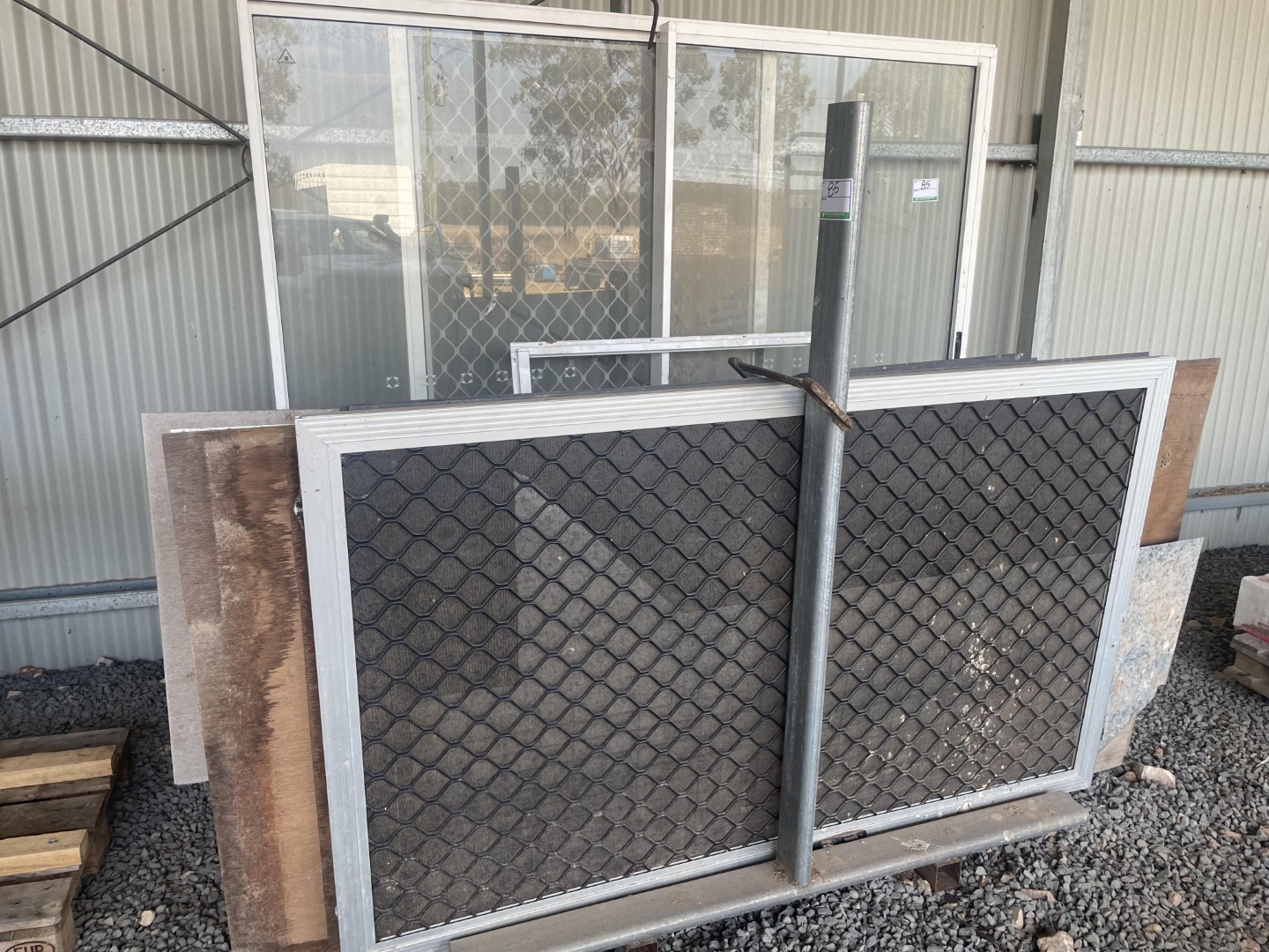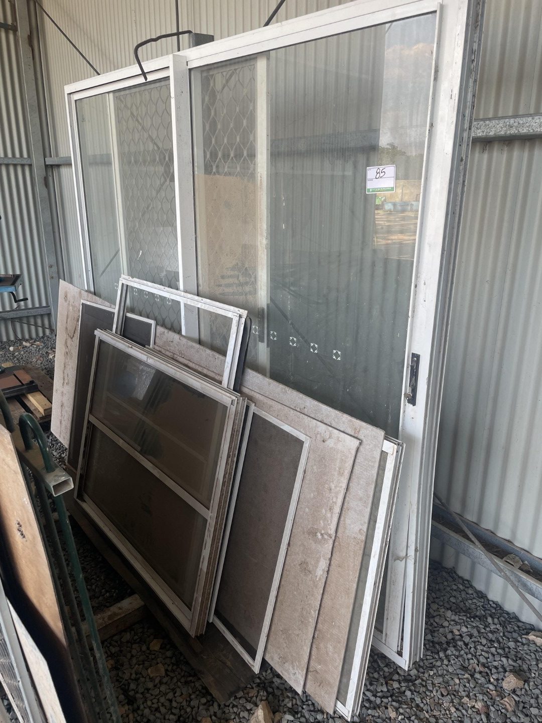 Lot 85. Sundry windows, glass sliding door, screens, alloy fence panels including sliding door approx. 2400mm wide x 2100mm high.