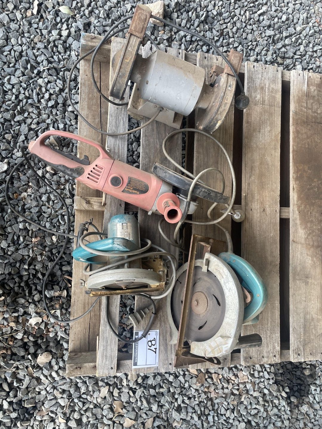 Lot 87. 2 x Makita electric circular saws, double end bench grinder, trade tools 9” grinder, all were running when last used