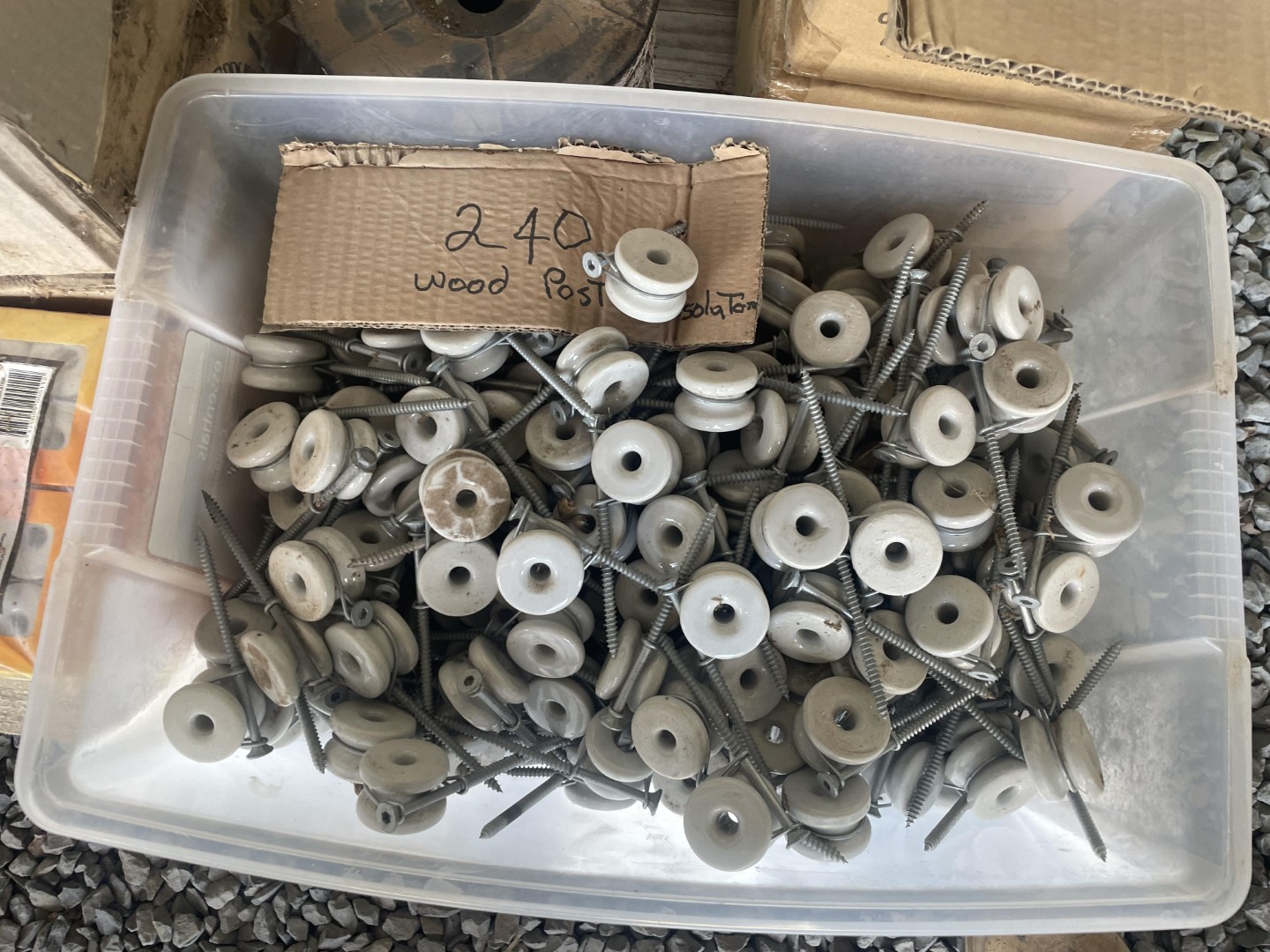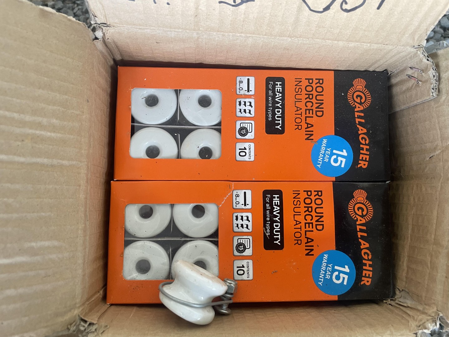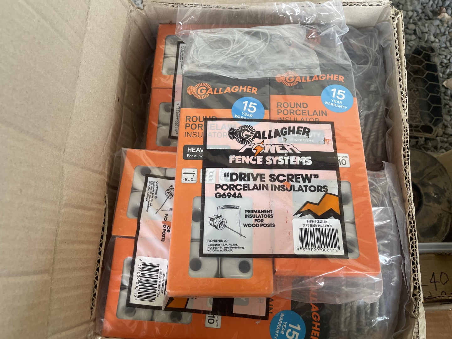 Lot 92. 2 boxes of 5” bugle head screws- 3 boxes of Gallagher Derive Screw Porcelain Insulators – 2 boxes round Porcelain insulators – Qty wood post insulators – 3 x electric fence units, were operating but not used for approx. 5 years.