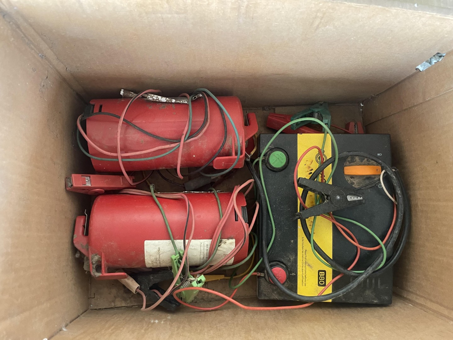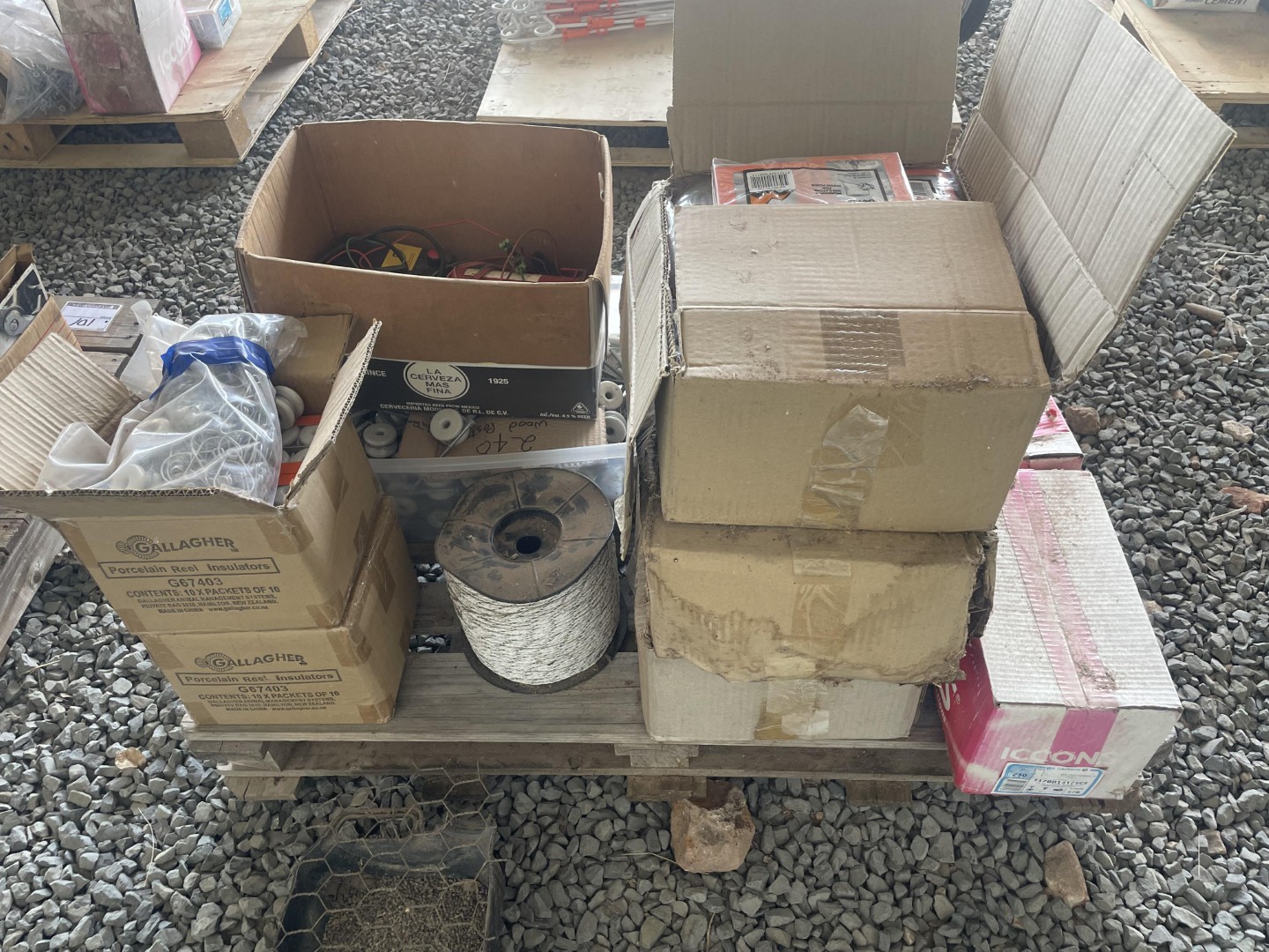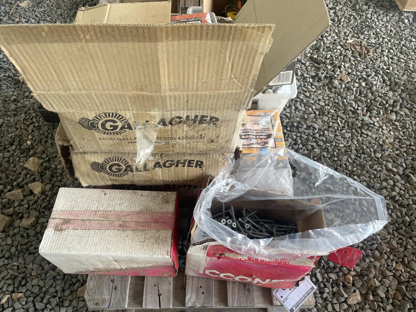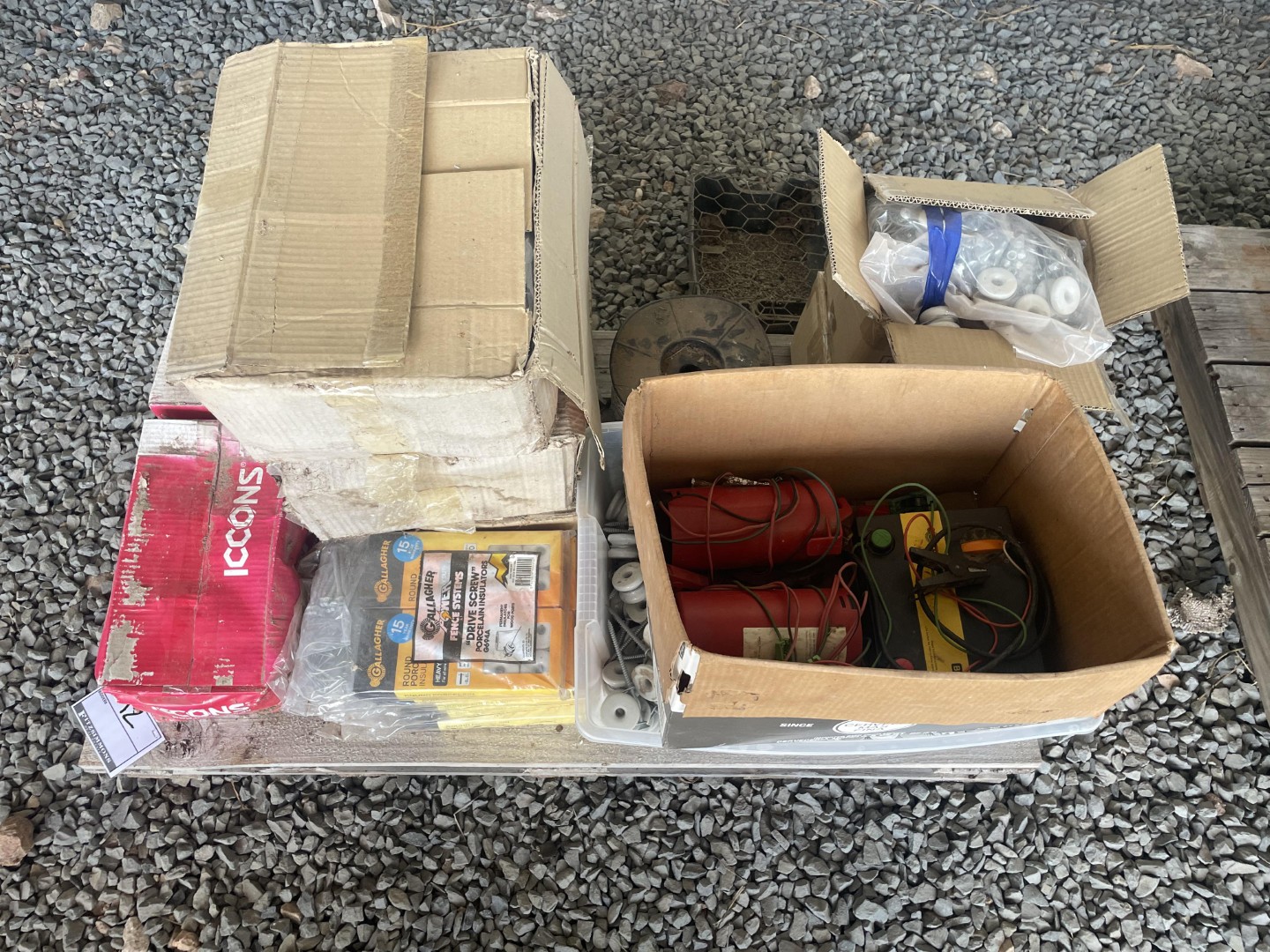 Lot 92. 2 boxes of 5” bugle head screws- 3 boxes of Gallagher Derive Screw Porcelain Insulators – 2 boxes round Porcelain insulators – Qty wood post insulators – 3 x electric fence units, were operating but not used for approx. 5 years.