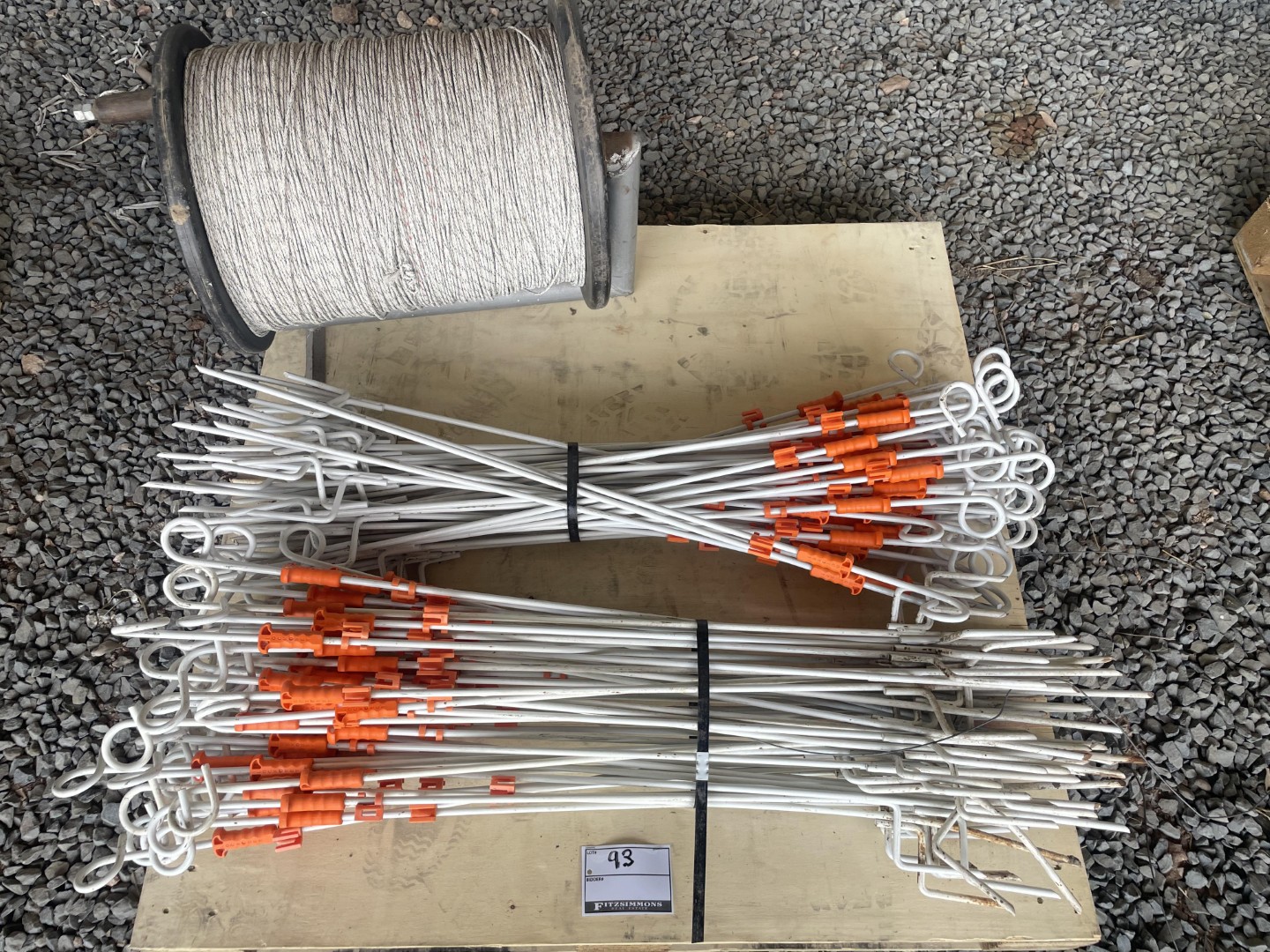 Lot 93. Qty electric fence posts and roll of electric fence cord.