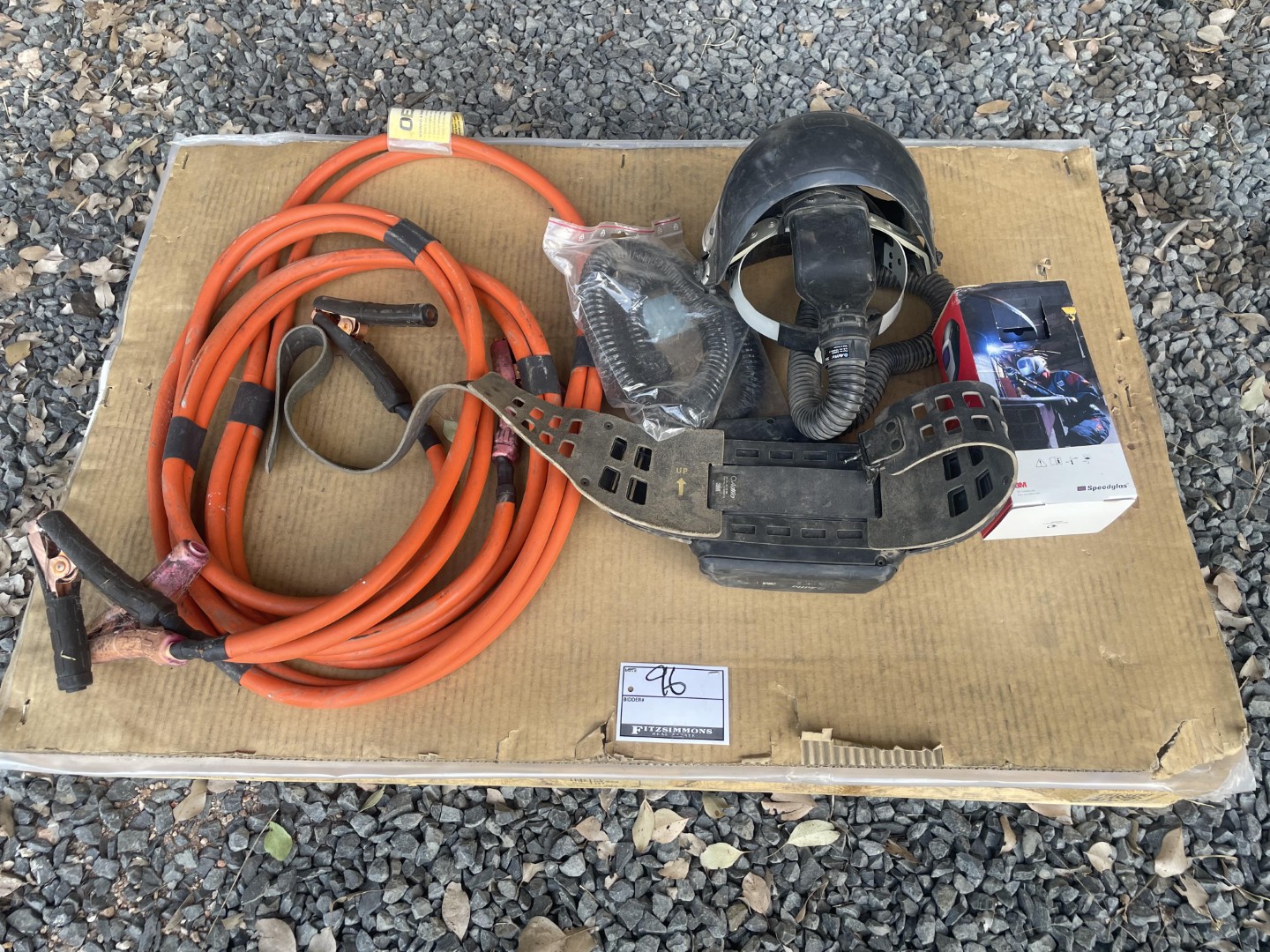 Lot96. Set of heavy Jumper Leads, Adflow air filter mask, has not been used for some time, re chargeable battery may need replacing.