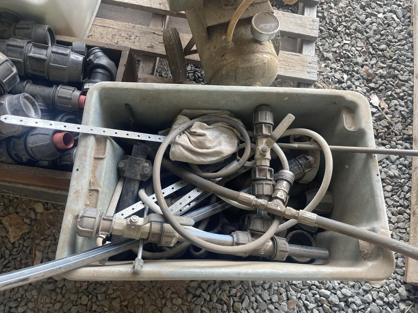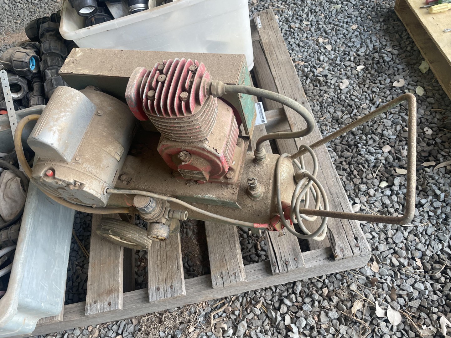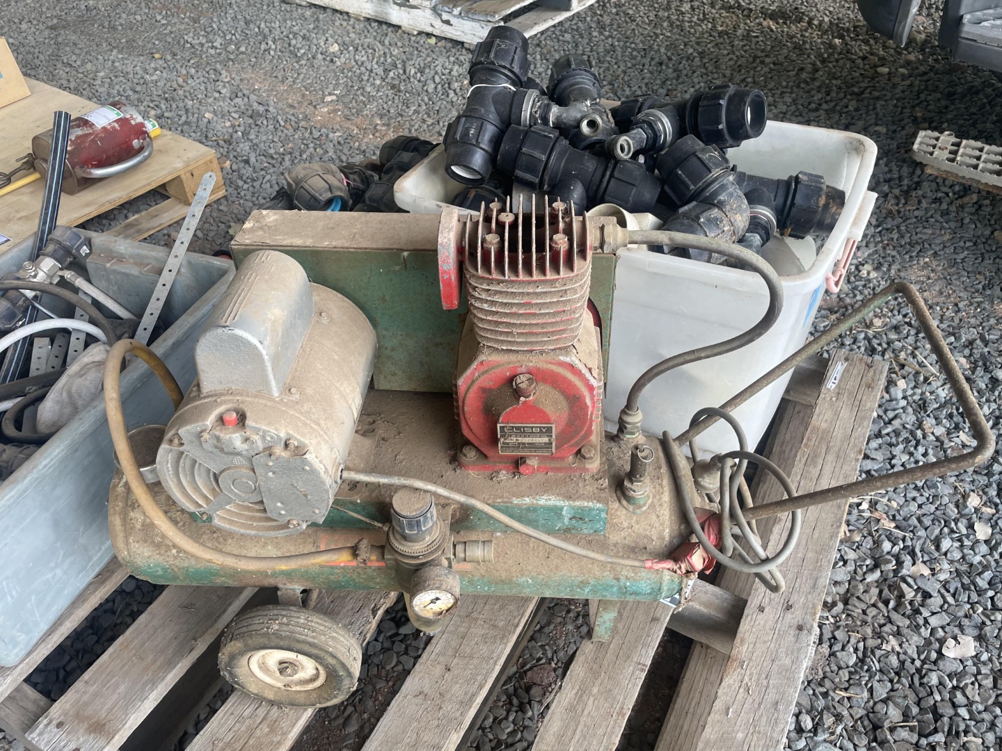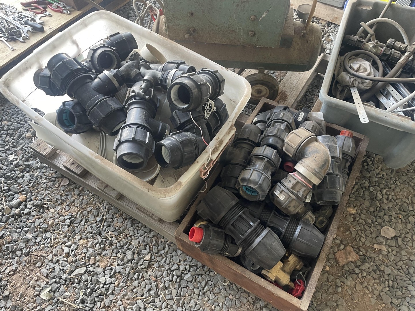 Lot 98. Qty large Poly fittings, Small electric air compressor, was running when last used but has not been used for many years.